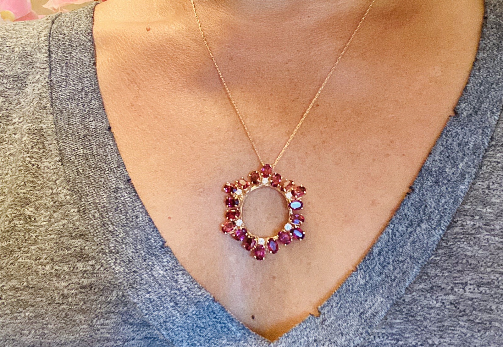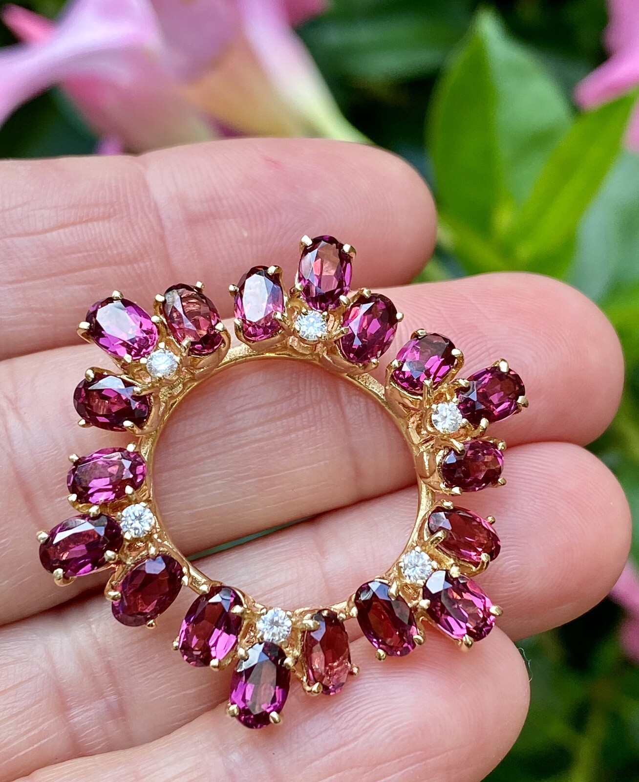 This stunning estate vintage pendant features an 18k yellow gold mounting accented with brilliant G-H VS round cut diamonds and a beautiful oval pink tourmaline gemstones. Necklace can easily be threaded through the pendant frame.