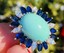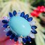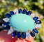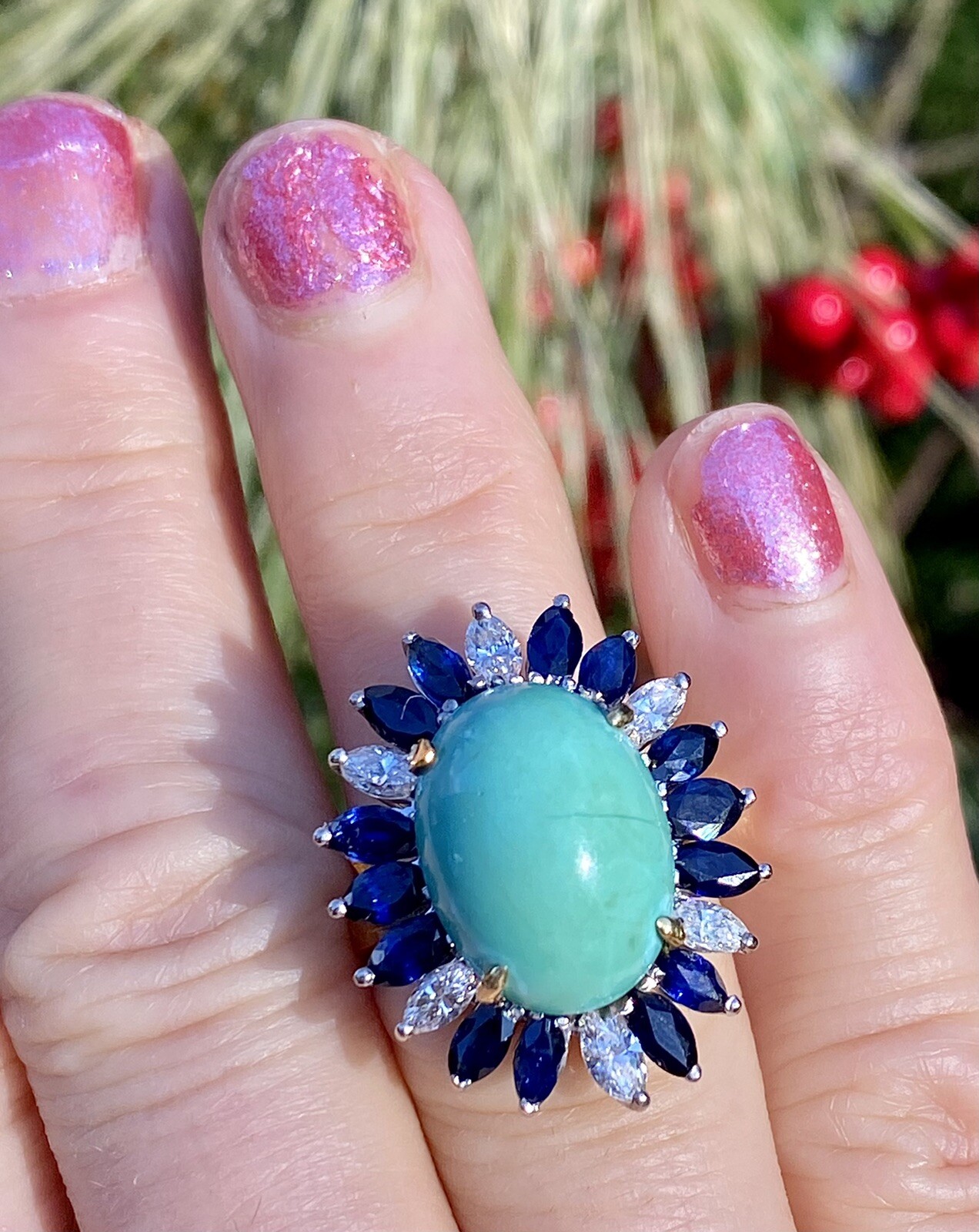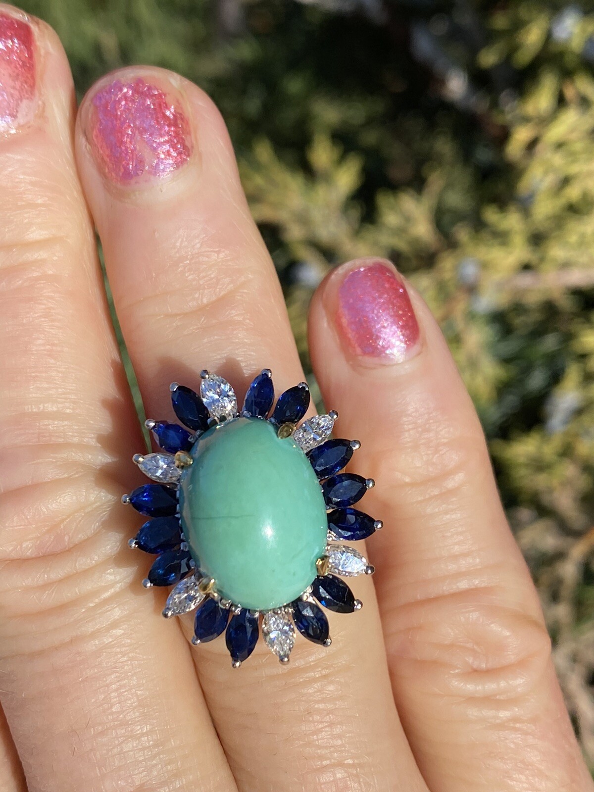 This stunning vintage estate ring is set in 18k yellow gold featuring a beautiful turquoise cabochon gemstone, totaling approximately 12.16 carats. The stone is further set in cluster design set with six marquise cut white diamonds and marquise cut blue sapphires. The total sapphire weight is approximately 1.45 carats, and the total diamond weight approximately 0.75 carats.