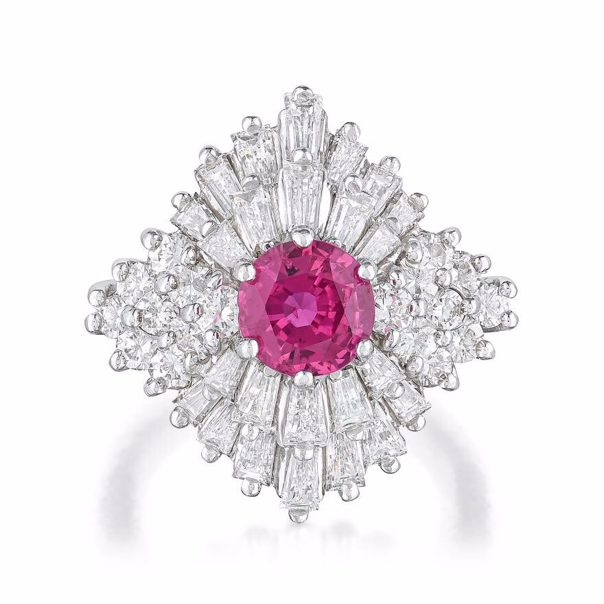 This beautiful vintage 1950s estate ring is set in 18k white gold and features a lively red glowing ruby with a halo cluster of glamorous fiery baguette and brilliant cut diamonds .  The ruby measures approximately 7mm long by 5.2mm wide and the  total diamond weigh is 1.00 carats. The length of the ring top is 18.6mm, and the ring rises approximately 10mm from the finger.  A medium sized ring with excellent firepower!