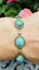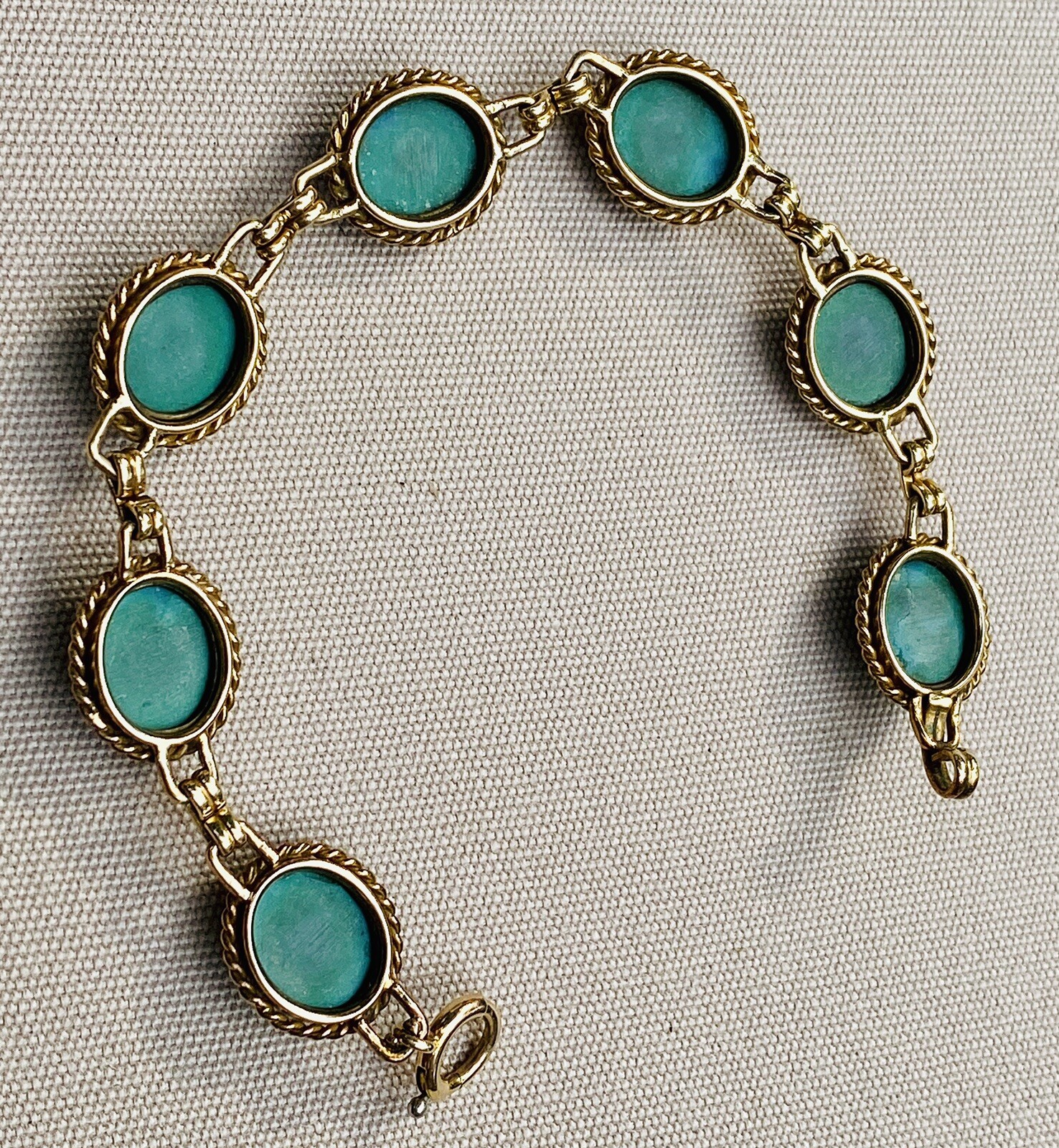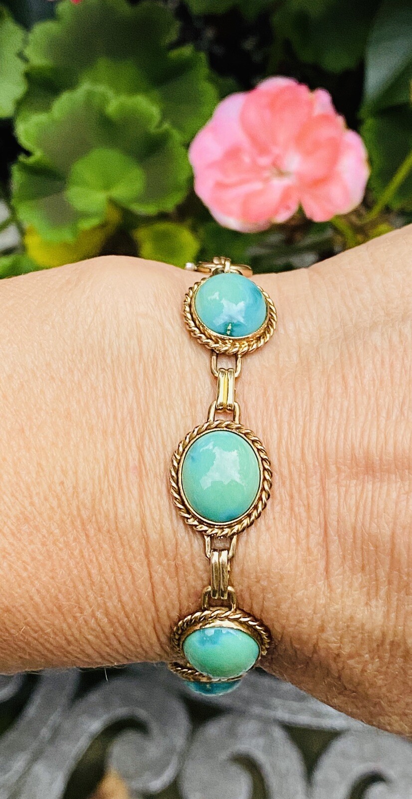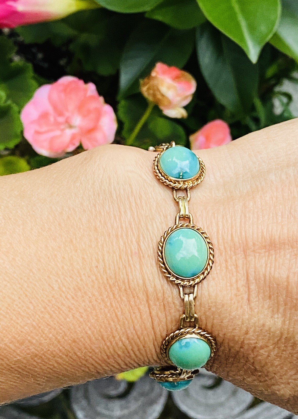 This beautiful vintage 1950s bracelet is set in rich 14k yellow gold with multiple gorgeous turquoise gemstones in a link formation.