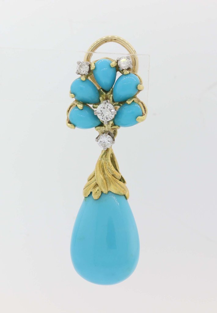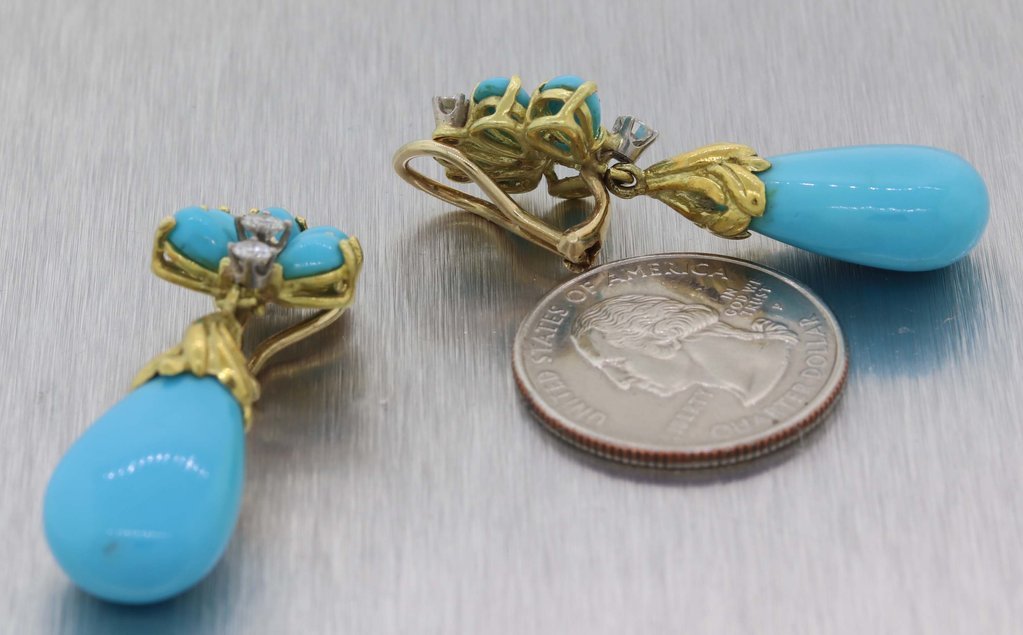 Vintage Estate 1970s Mid Century 18k Gold Diamond Turquoise Drop Dangle Earrings