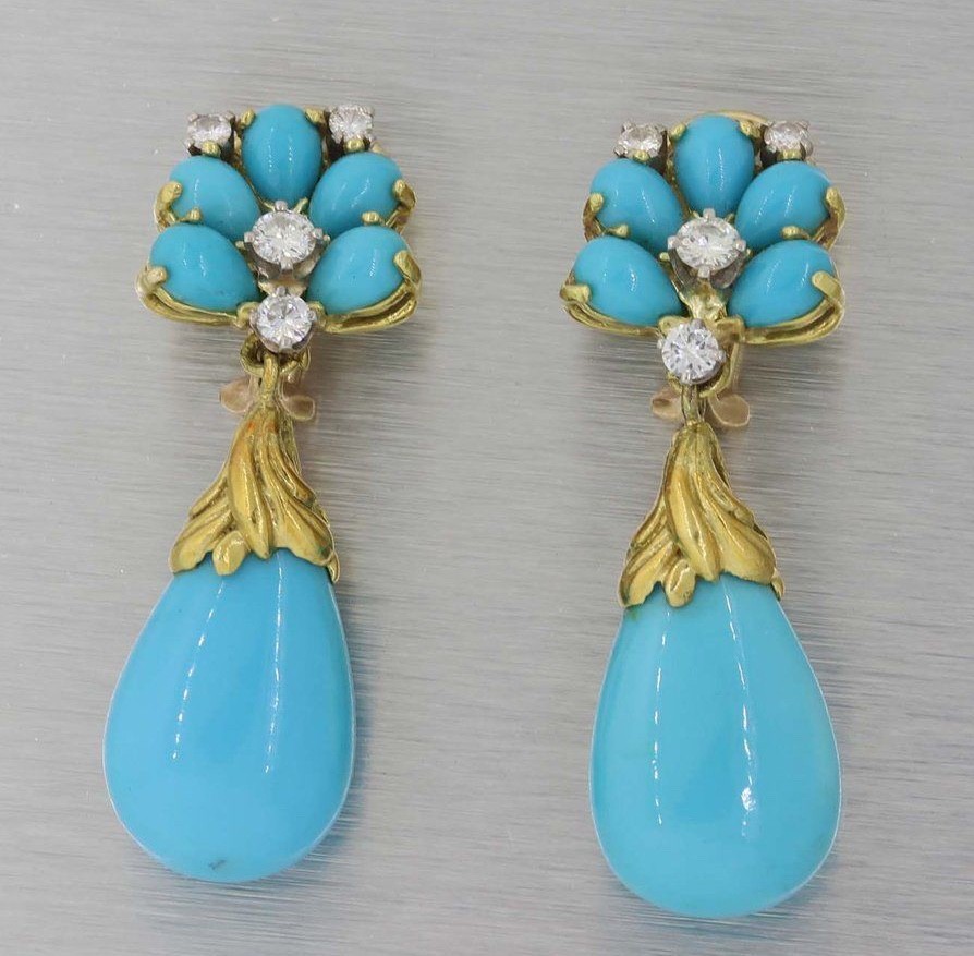 Gorgeous Vintage Estate Mid Century 1970s 18k Yellow Gold Turquoise .80ctw Diamond Drop Dangle Earrings.   Attributed to La Triomphe... these are identical in every way to a similar lighter colored pair that was marked. From the same collector.