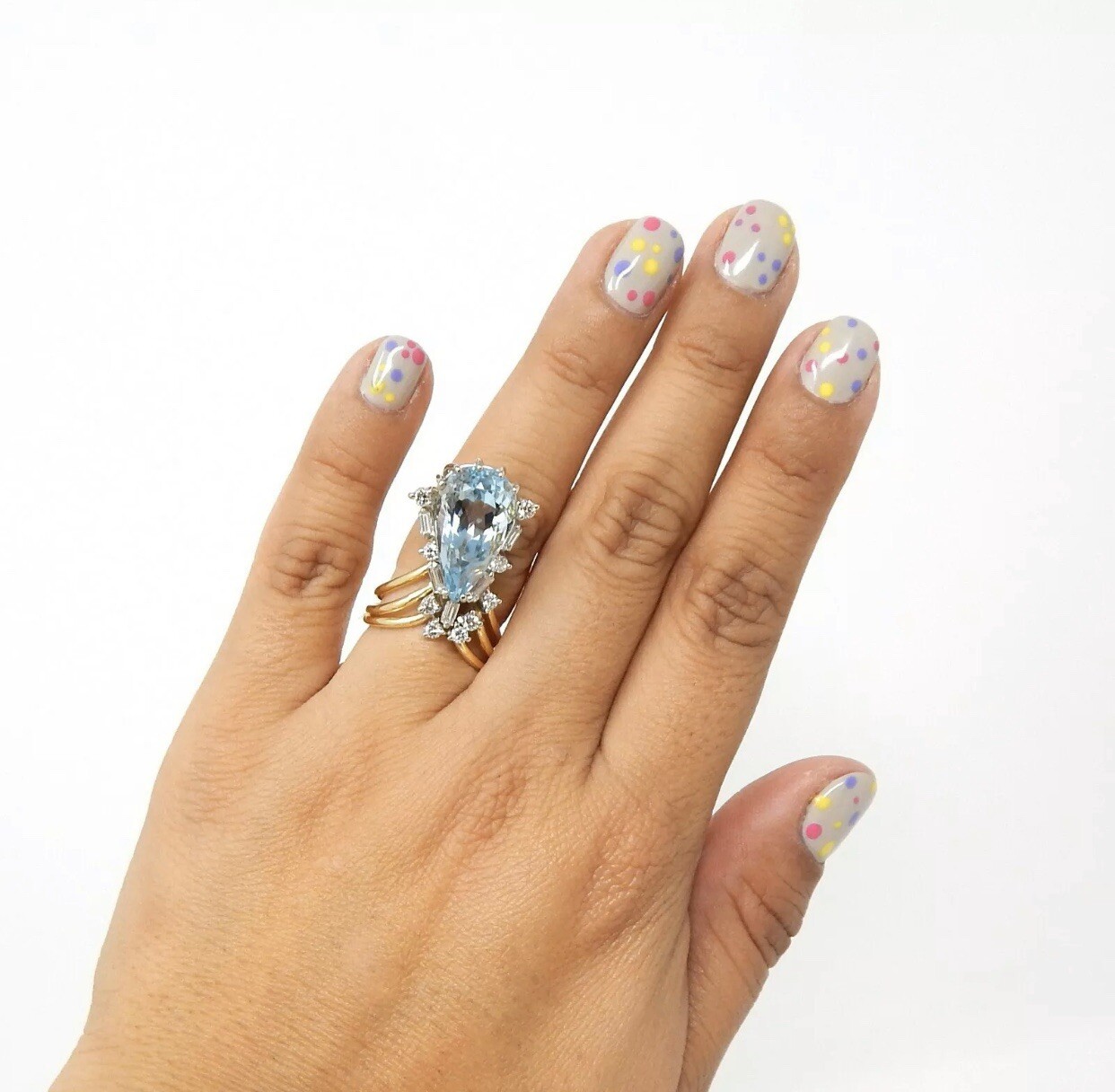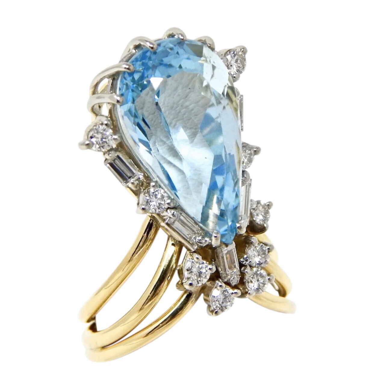 This stunning retro ring is set in 18k yellow gold, featuring a pear shaped faceted natural aquamarine gemstone that weighs about 7.00 carats.
