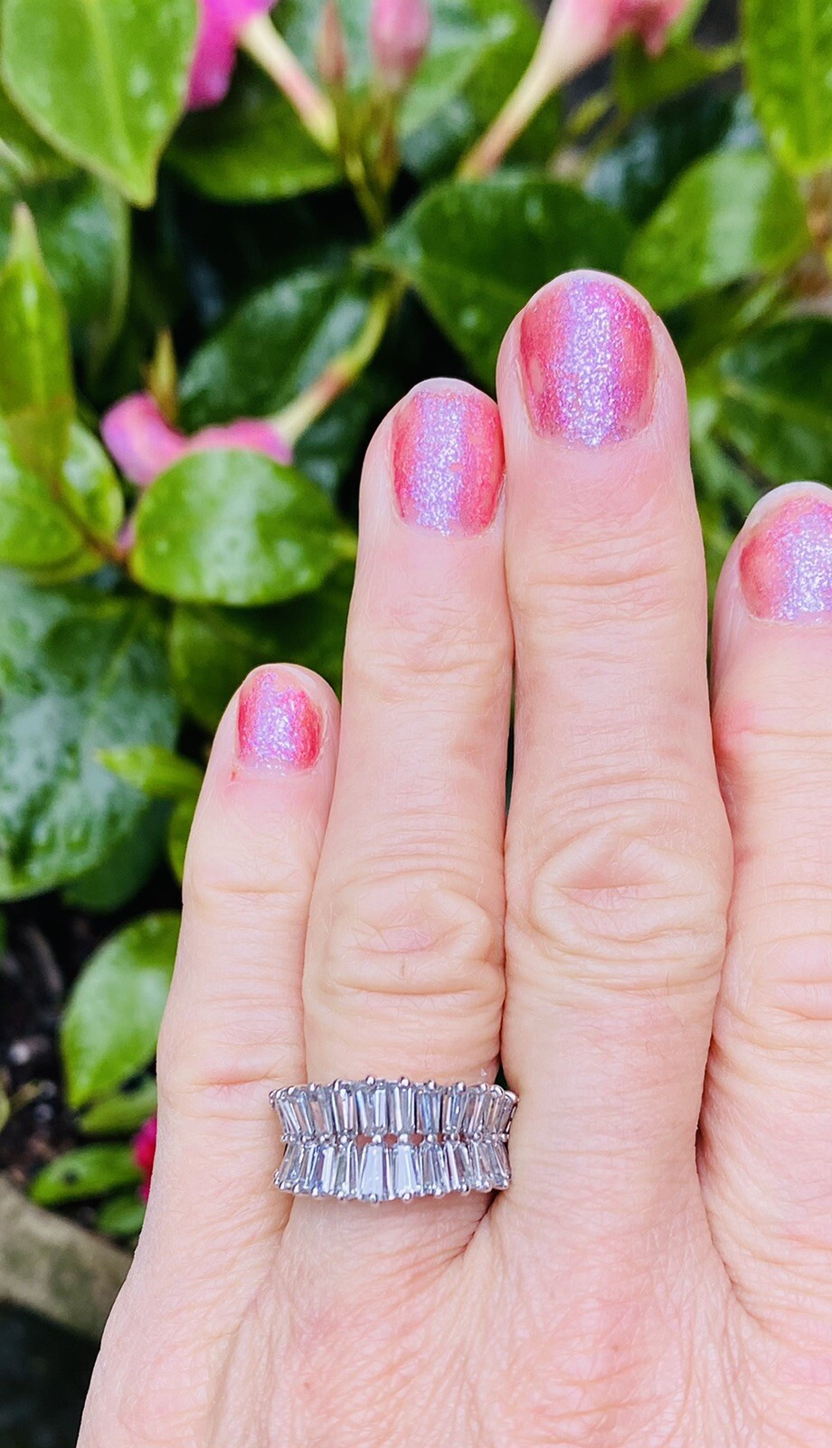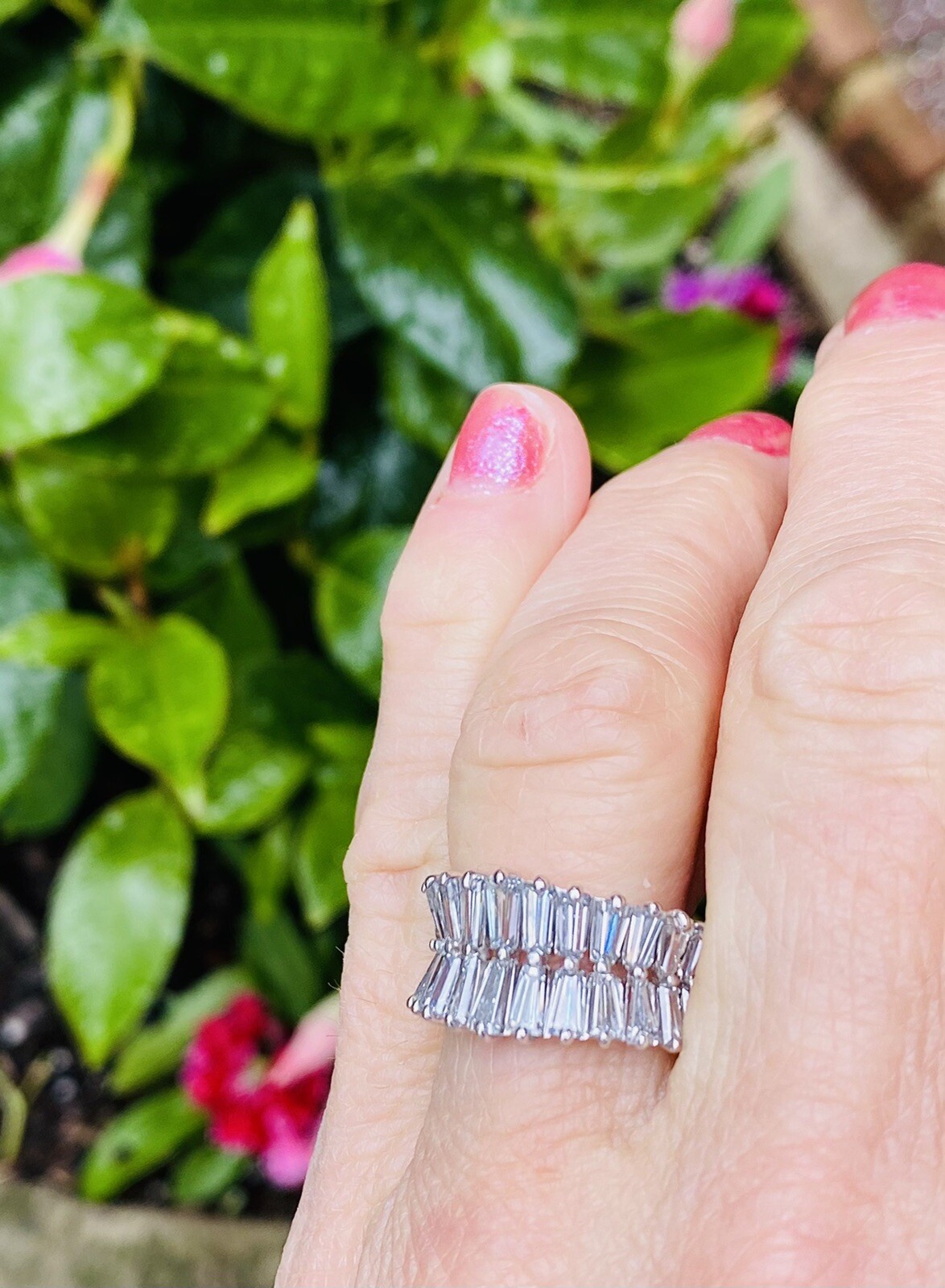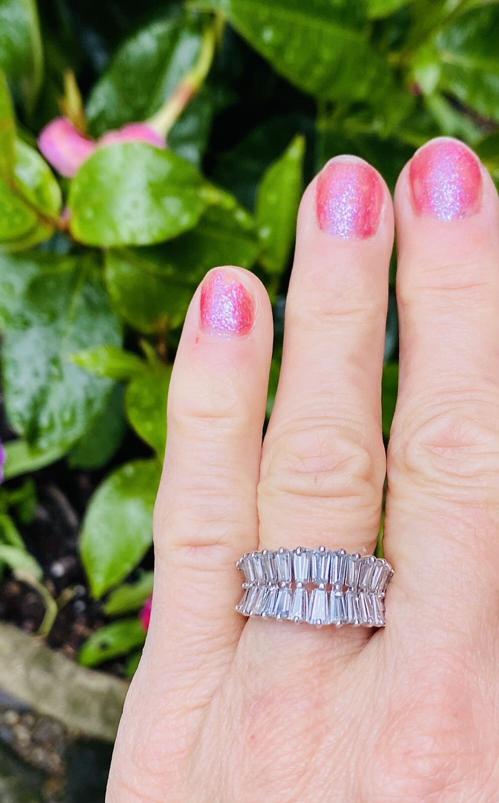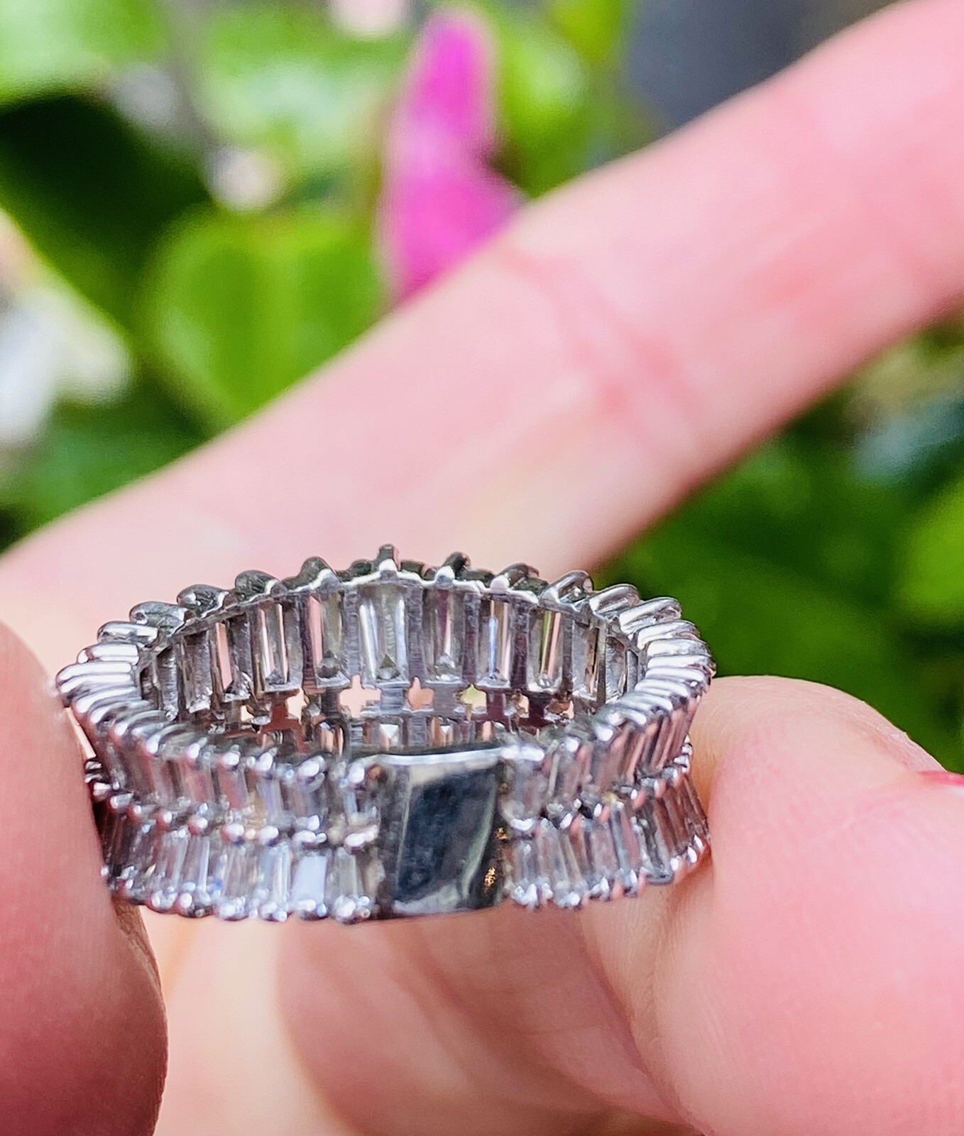This impressive ring features glamorous fiery baguette cut diamonds set on a mirrored double anniversary band. The total diamond weigh tis 2.60 carats and the size was increased to a size 7. It is able to be resized now as needed.
