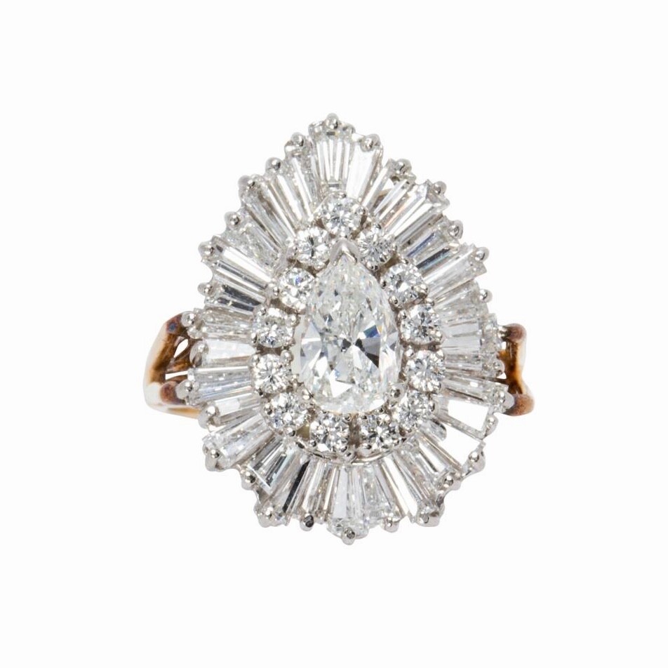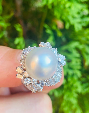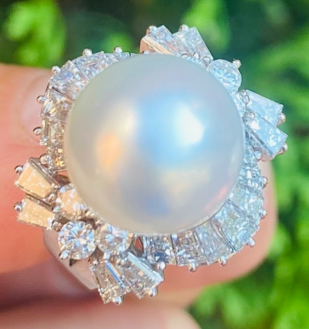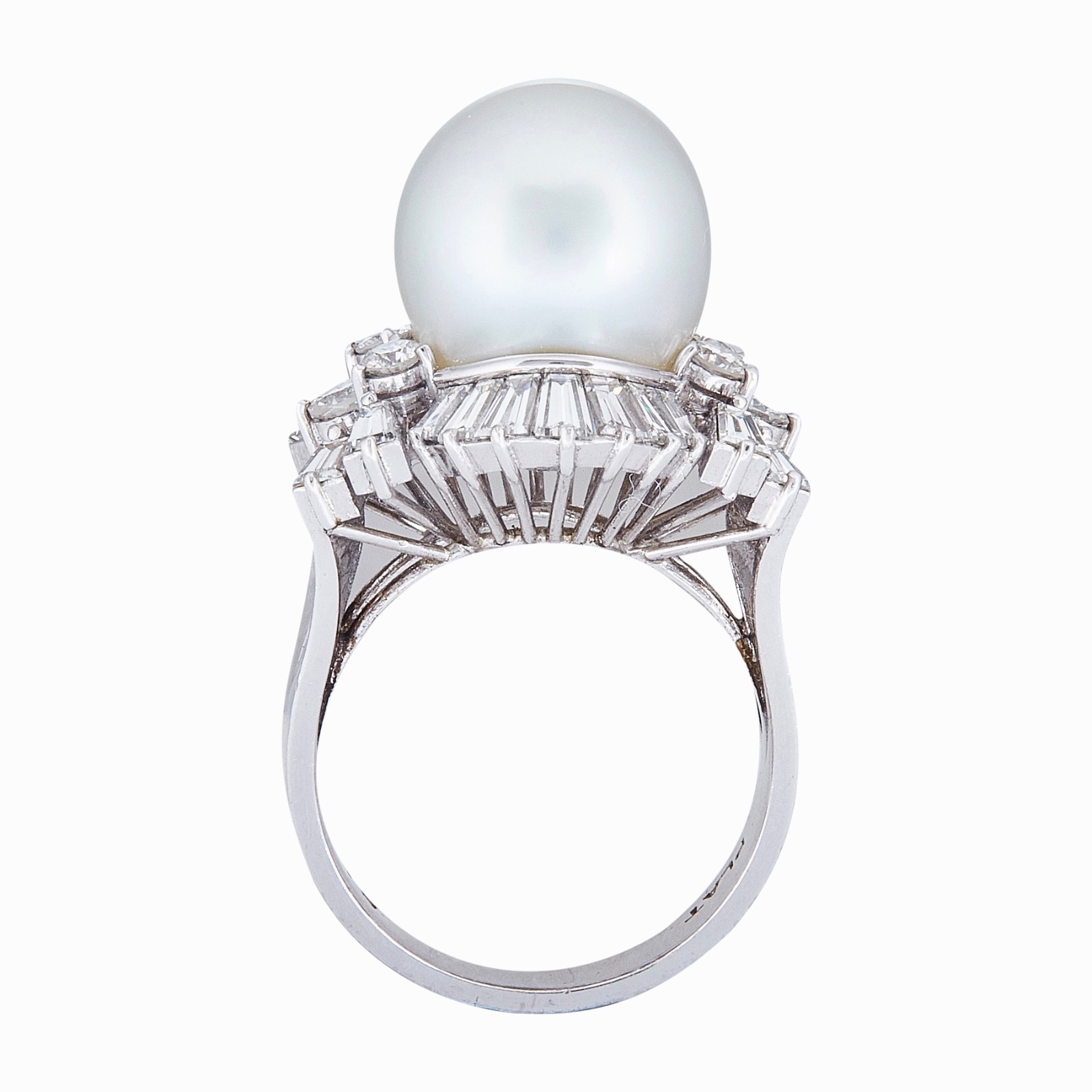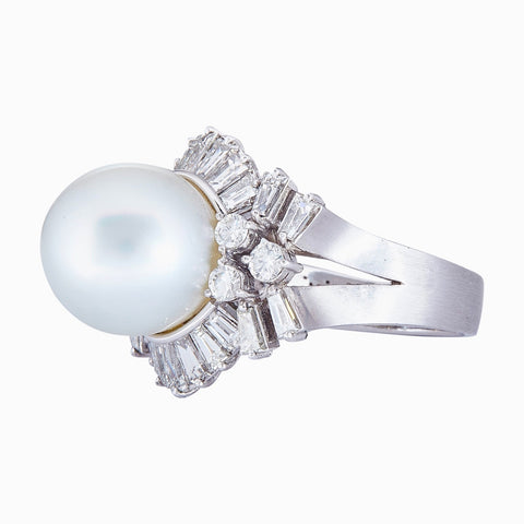 This stunning vintage estate ring is set in platinum centering a beautiful white lustrous 12.2mm South Seas pearl. The pearl is further surrounded by a halo of baguette and brilliant cut diamonds. The total diamond weight is 1.40 carats.
