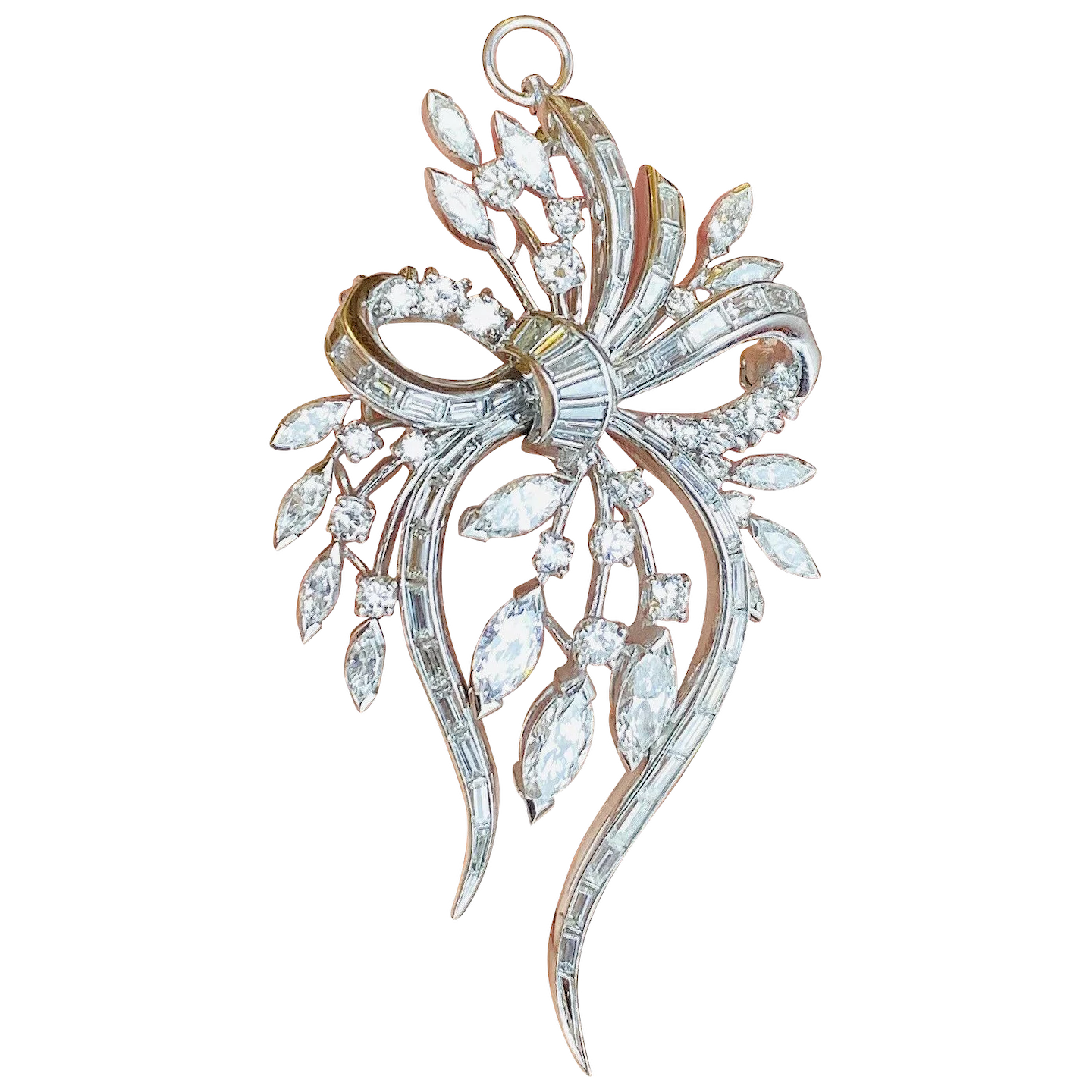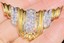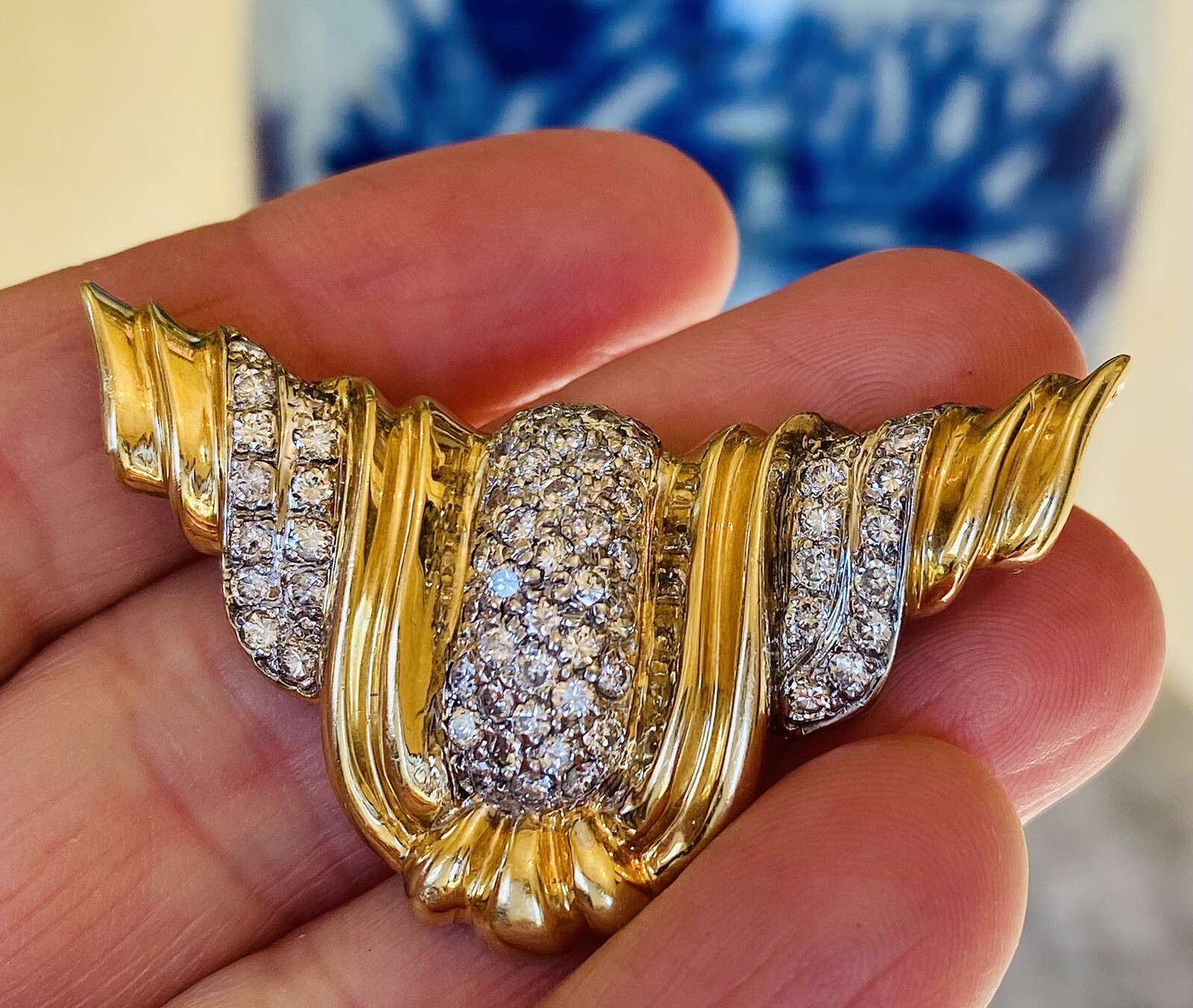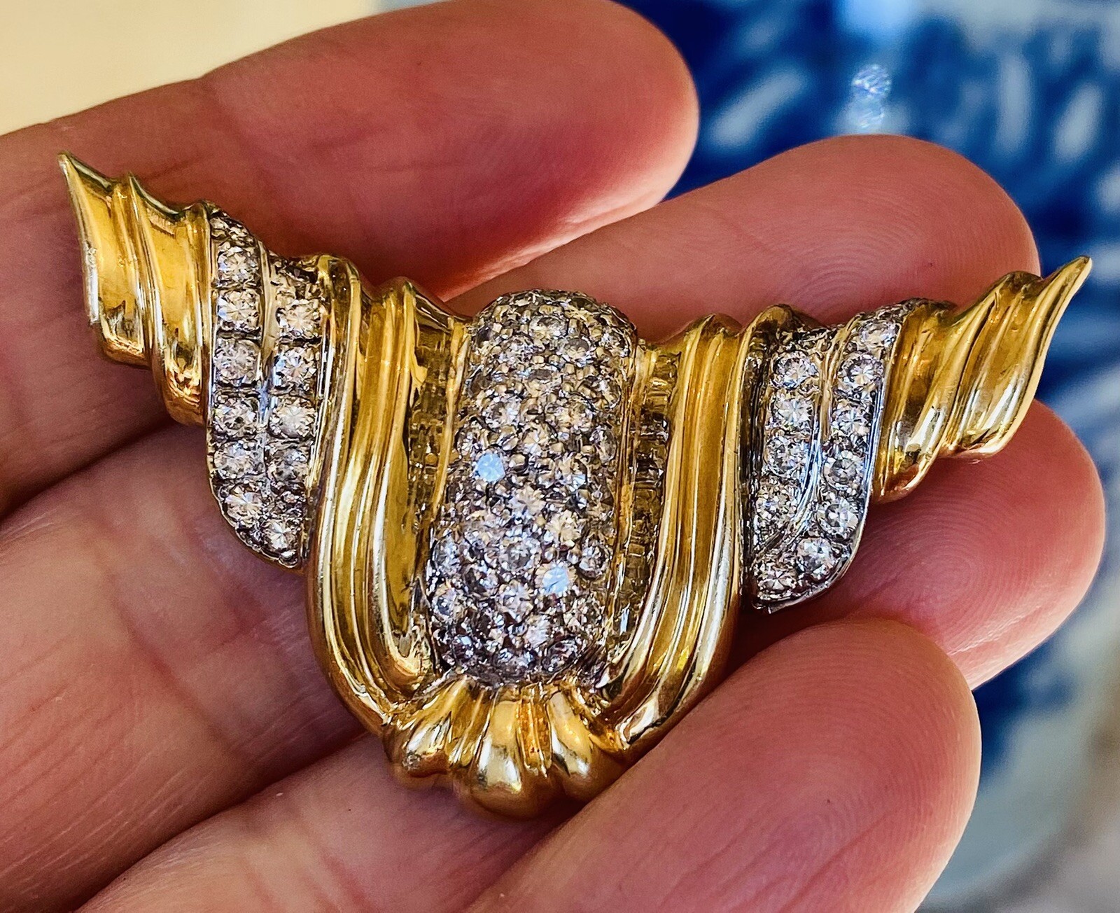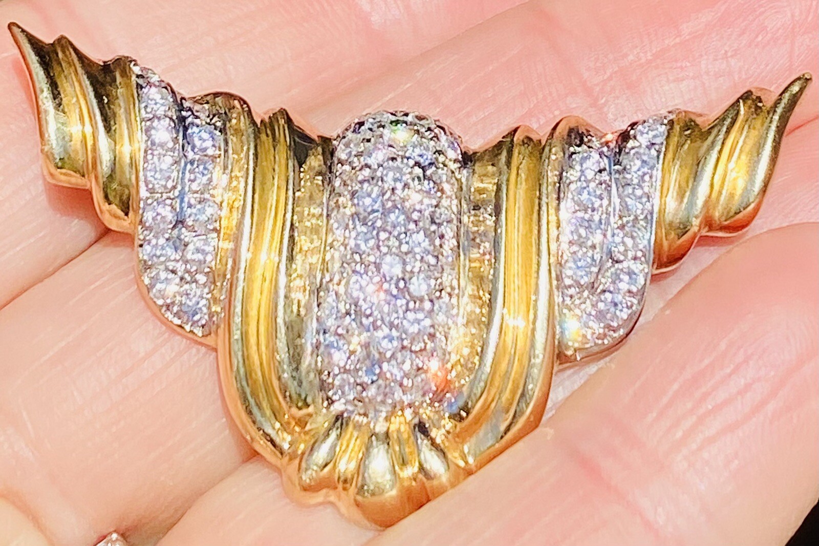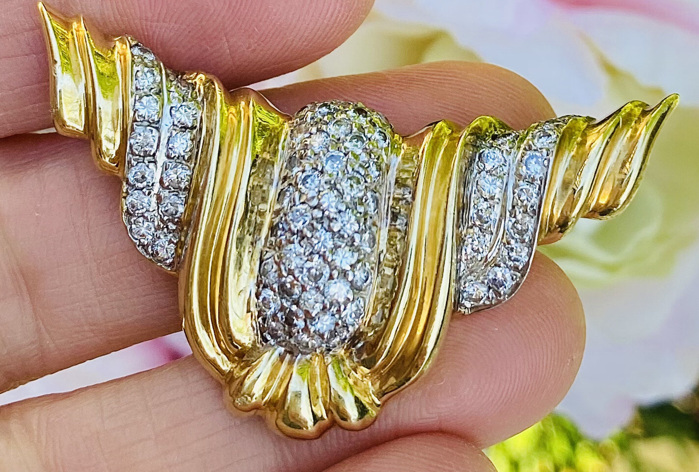 This striking piece of jewelry is crafted in beautiful 14K yellow and white gold and features a dazzling array of pave set diamonds in the design, total weight of approximately 1.80 carats. The piece is set with two large bails on the back to fit a variety of chain or omega style necklace pieces.
