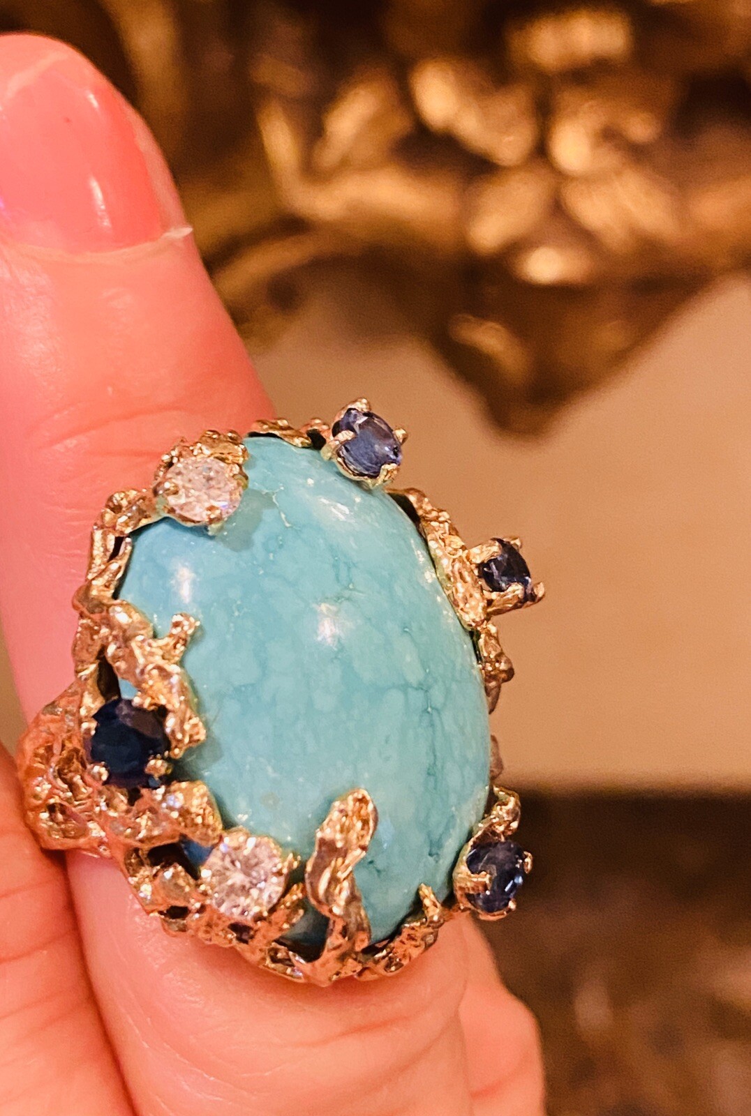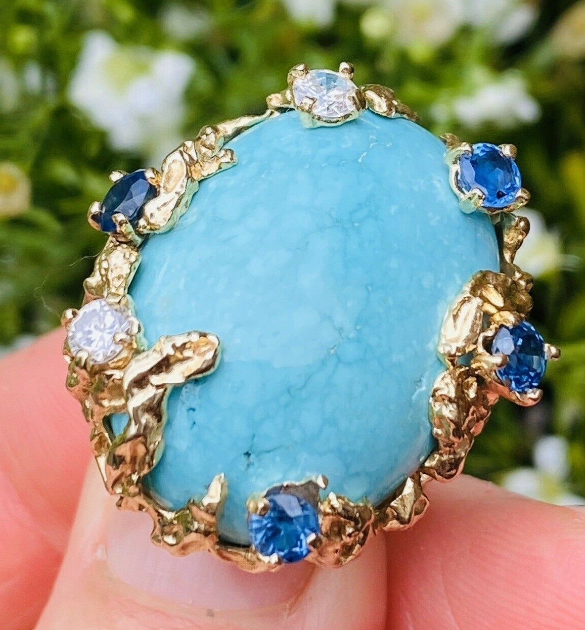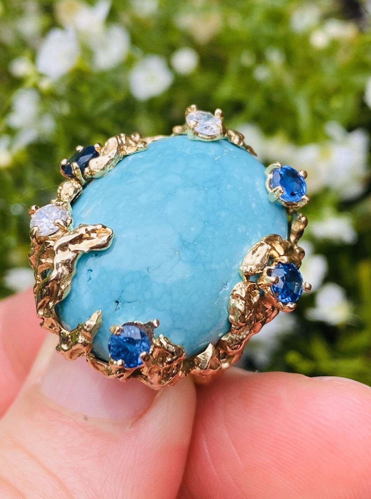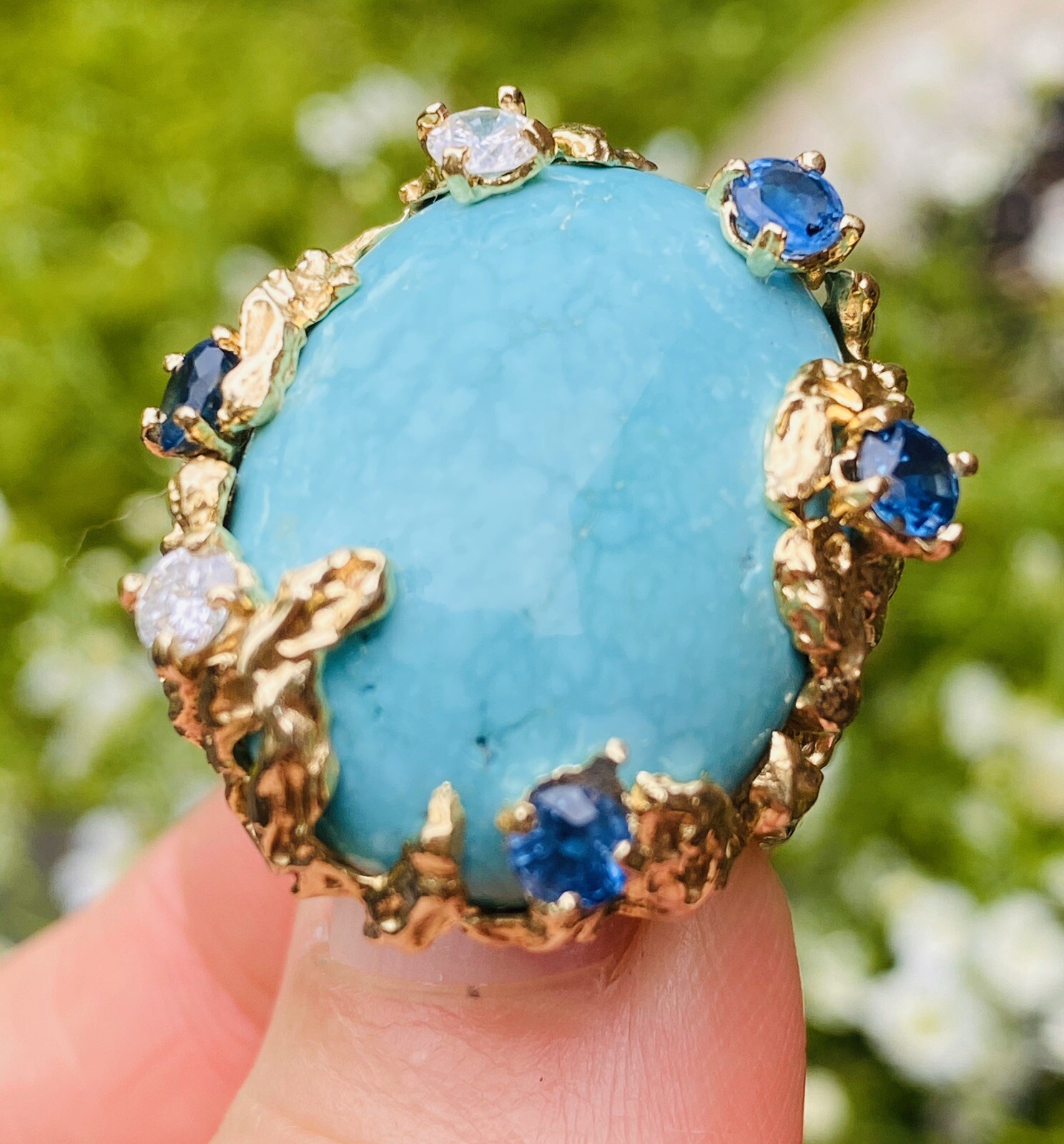 Vintage Heavy 1960s Retro 18k Gold Turquoise Sapphire Diamond Ring