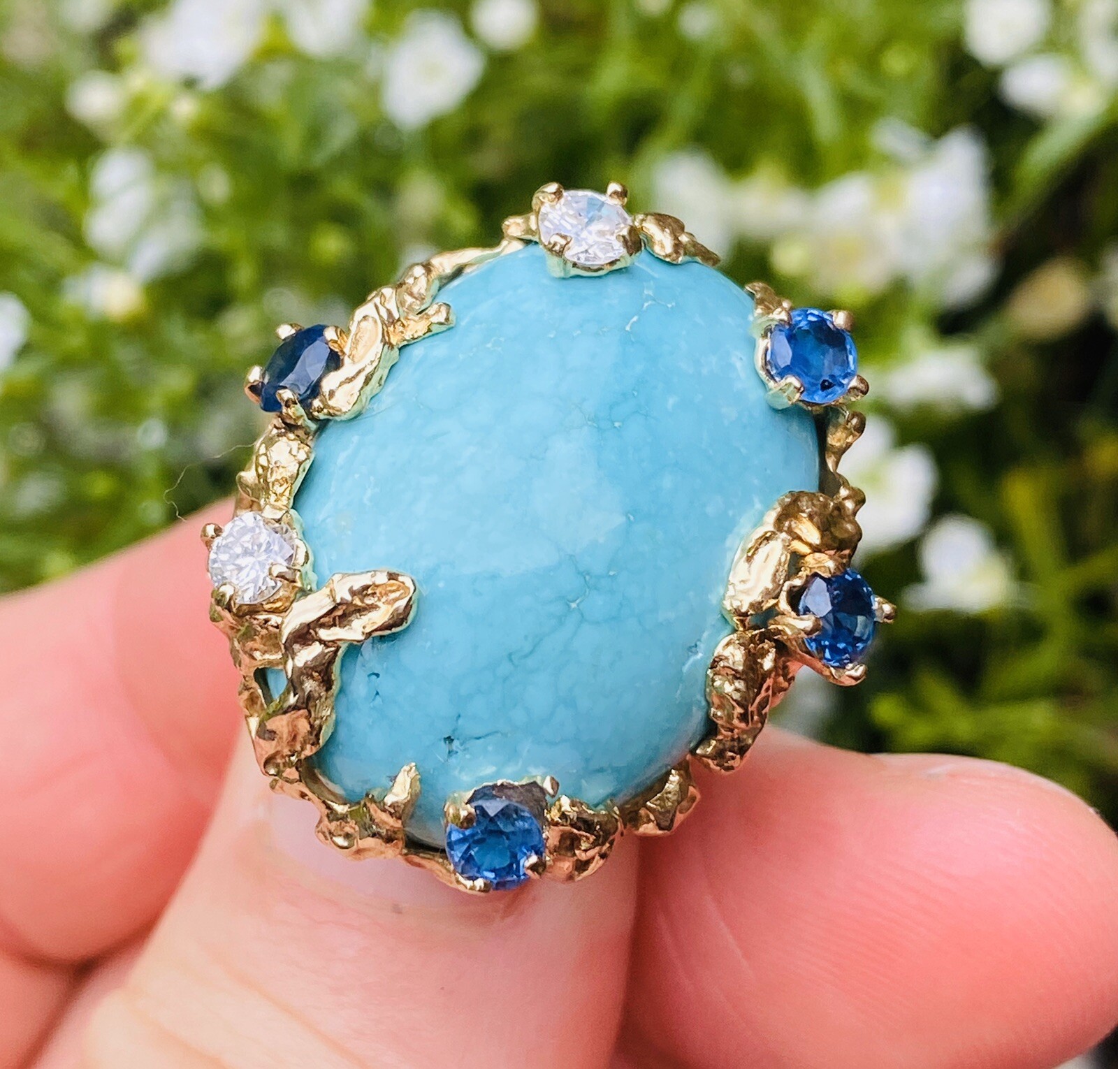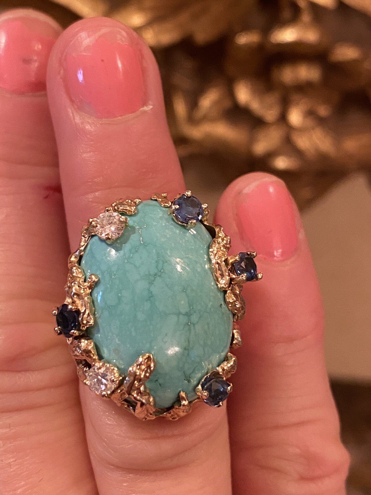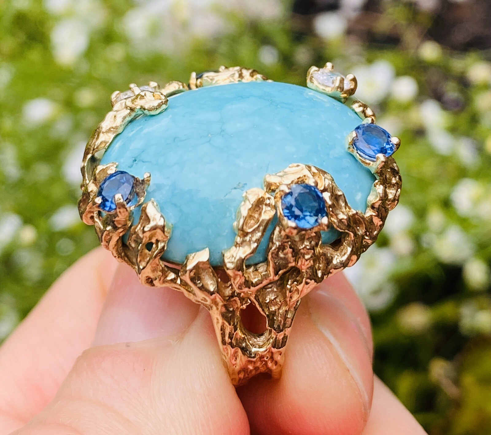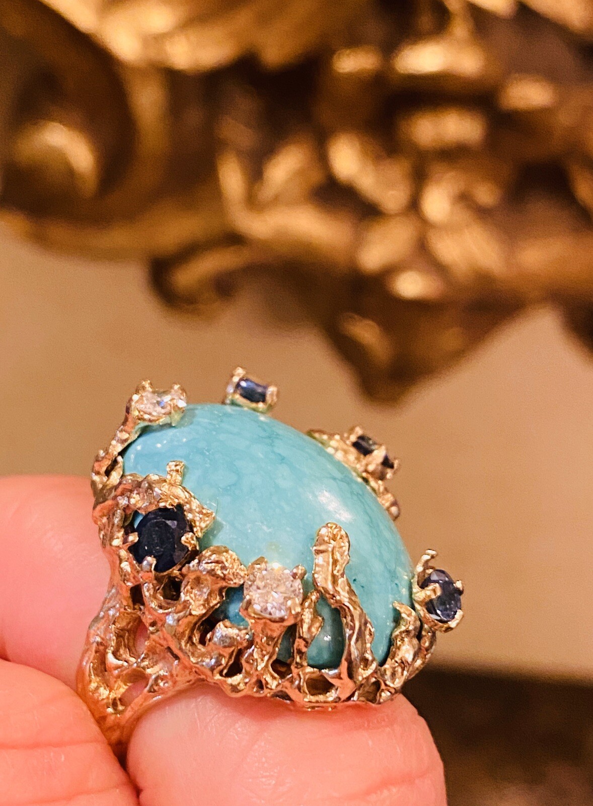 Vintage Heavy 1960s Retro 18k Gold Turquoise Sapphire Diamond Ring