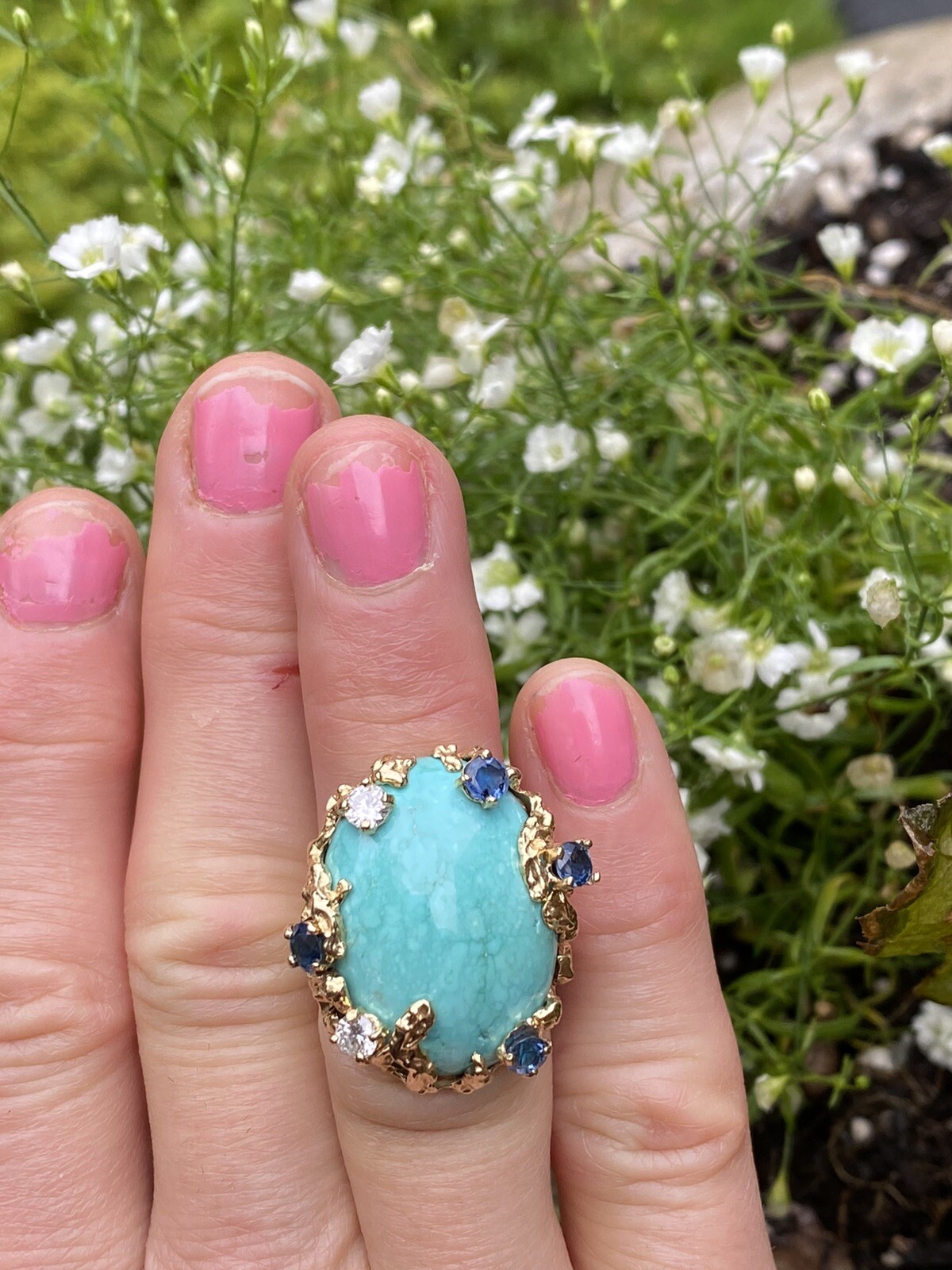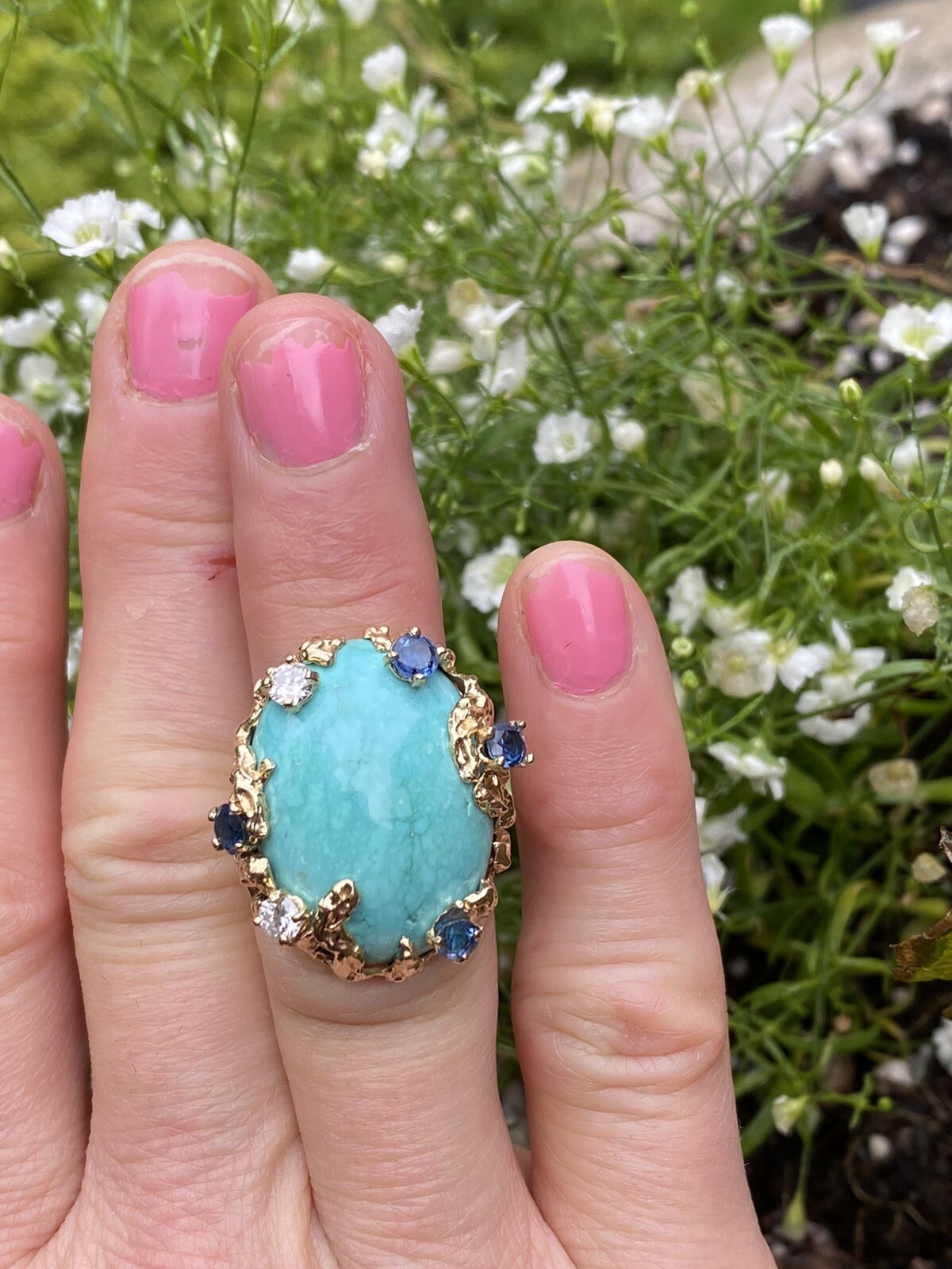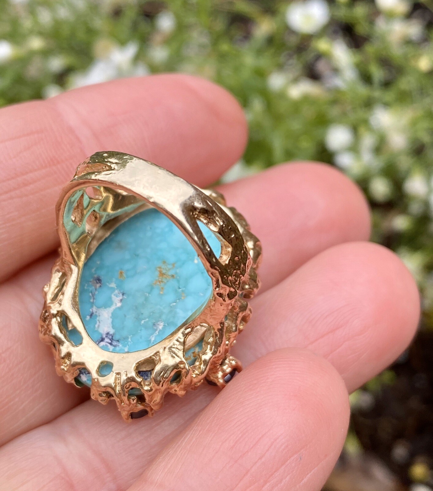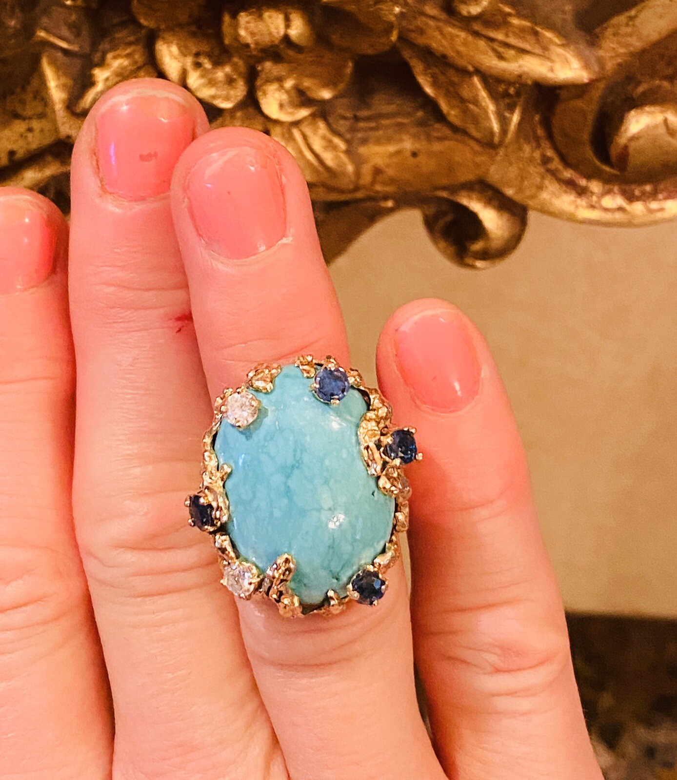 Vintage Heavy 1960s Retro 18k Gold Turquoise Sapphire Diamond Ring
