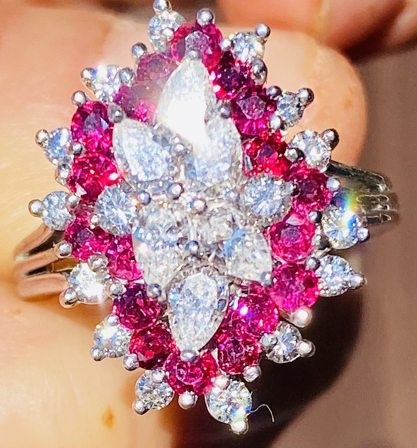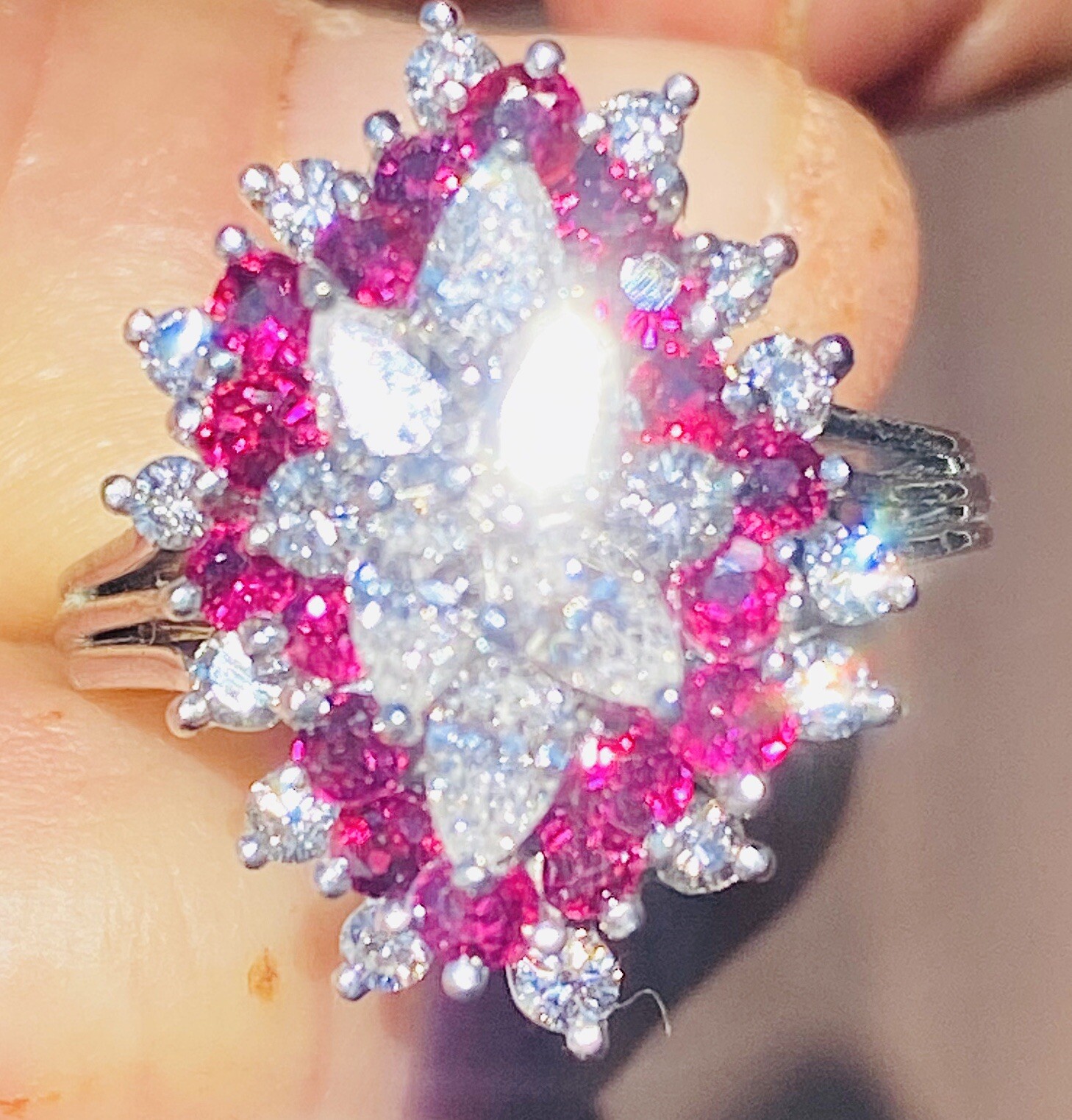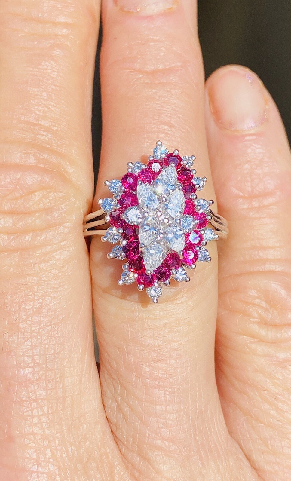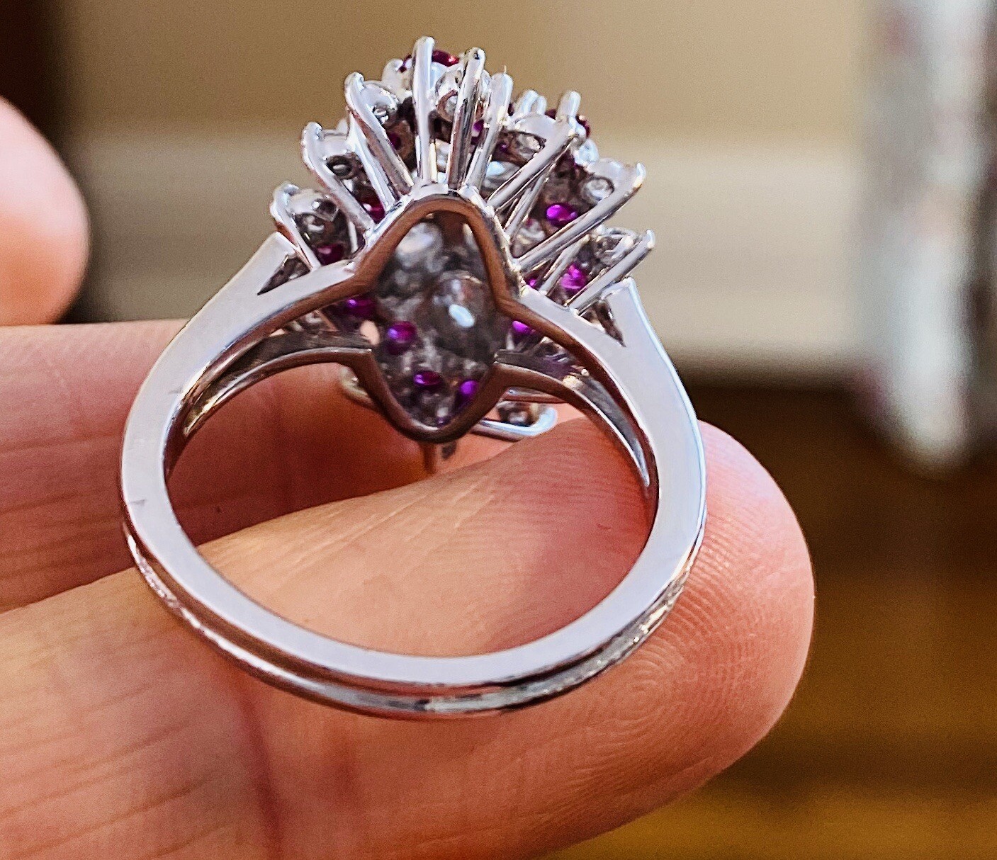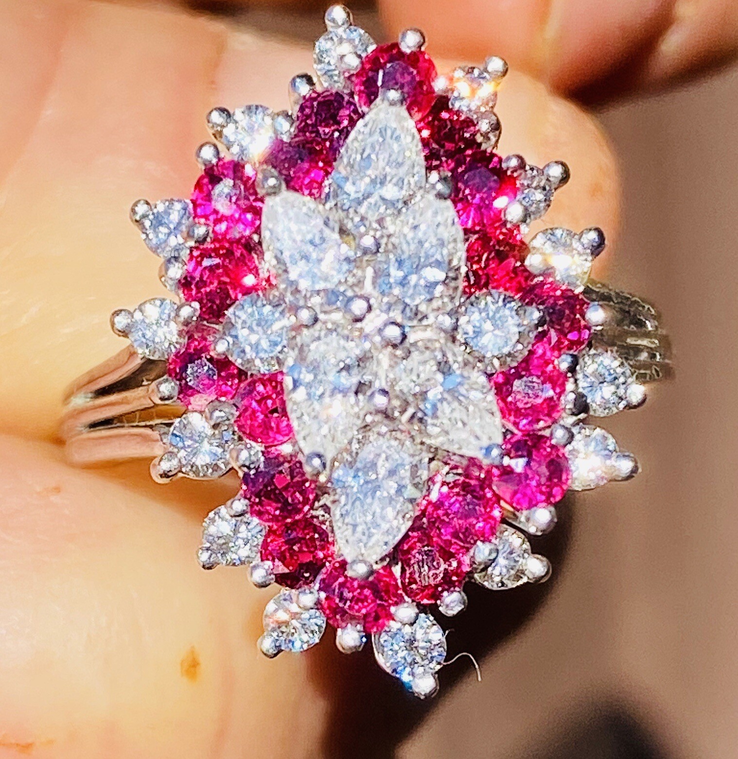 Striking Platinum Vintage Retro 2.50ctw Ruby Marquise Diamond Cluster Ring
