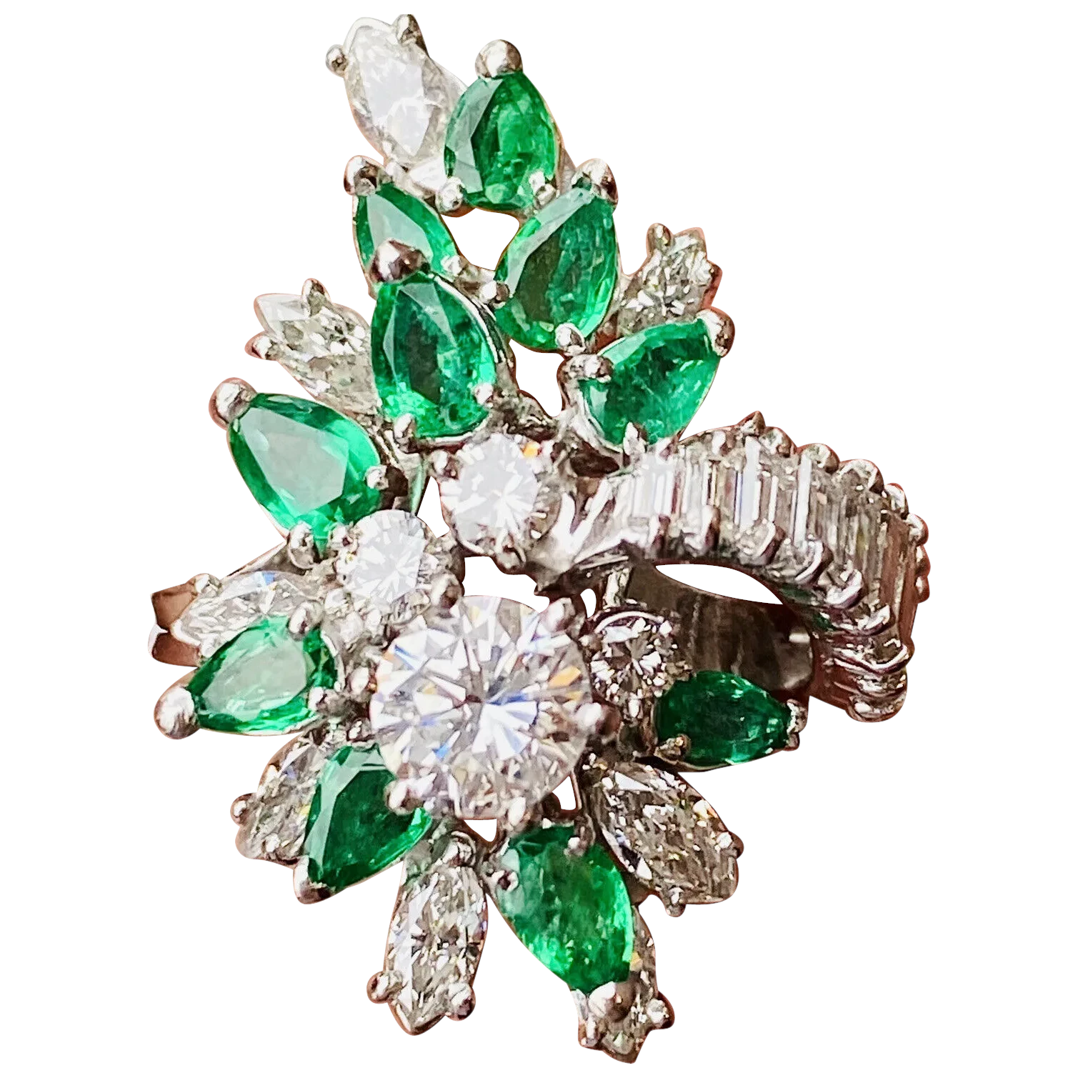 1950s Estate Heavy Vintage Platinum Diamond Baguette Pear Emerald Cocktail Ring