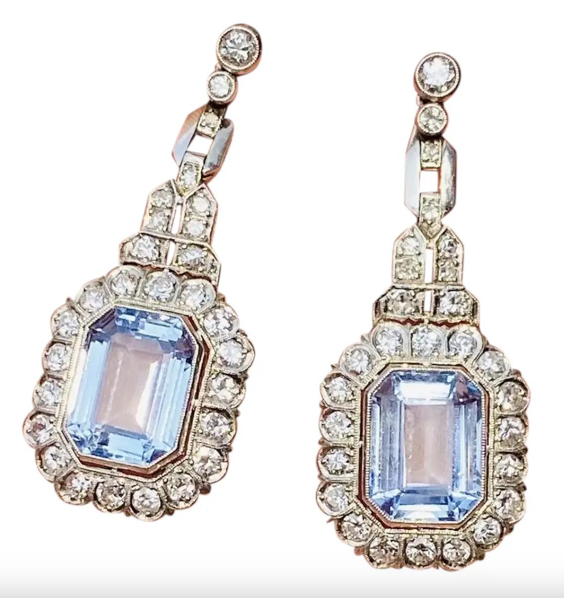 Vintage Art Deco Platinum Blue Aqua Spinel Diamond Halo Dangle Pendant Earrings