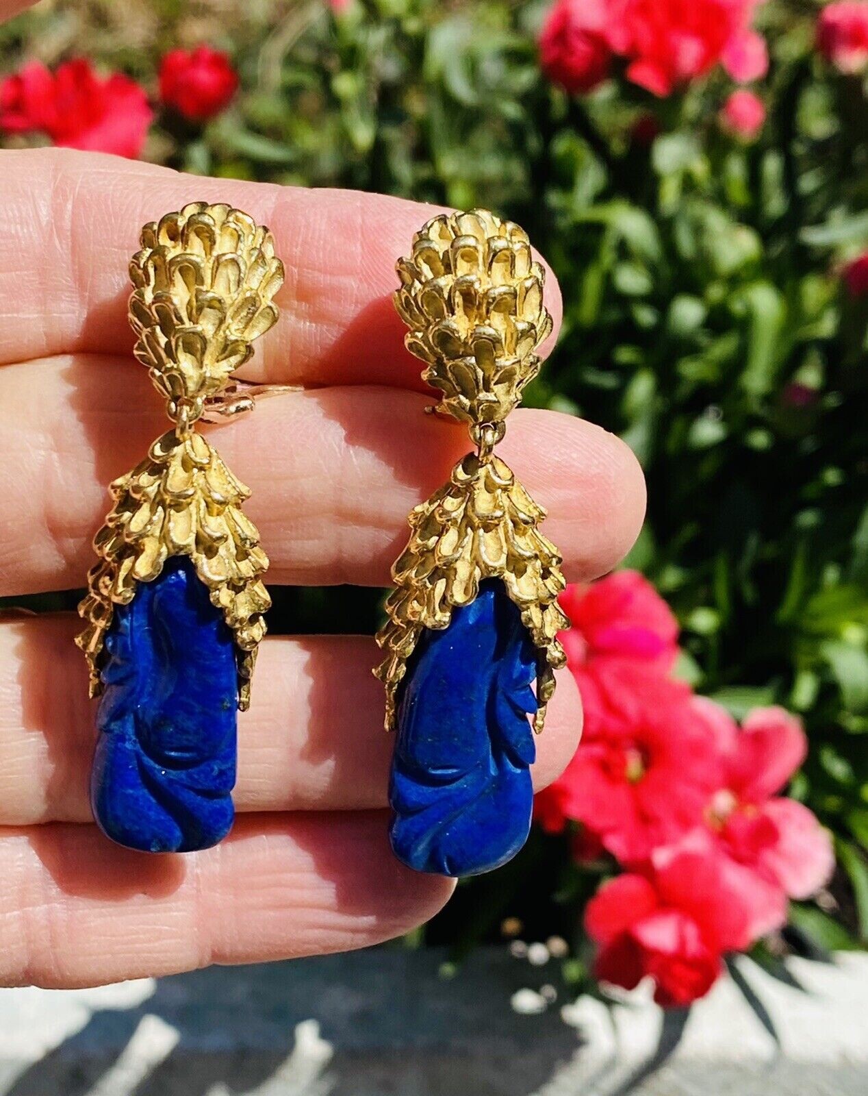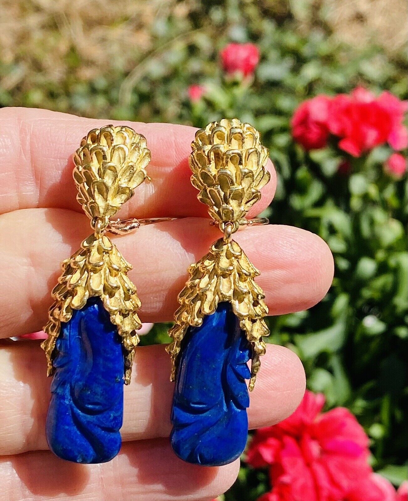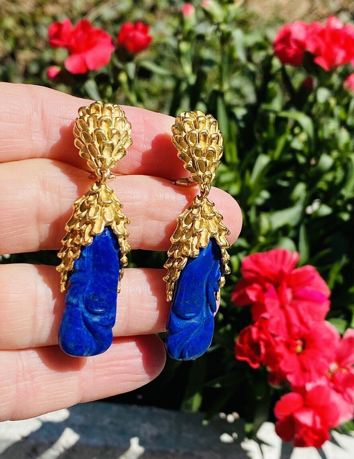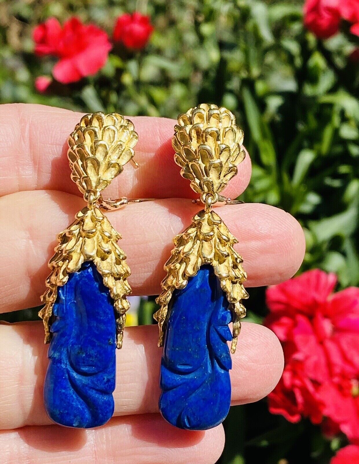 These impressive retro vintage 1960s-1970s statement earrings are set in rich texturized 18K yellow gold. The pendant style earrings feature two large carved royal blue lapis lazuli cabochon gemstones. The earrings dangle marvelously from the ear and while rich and heavy in gold weight they are still very comfortable set with posts and omega backs.