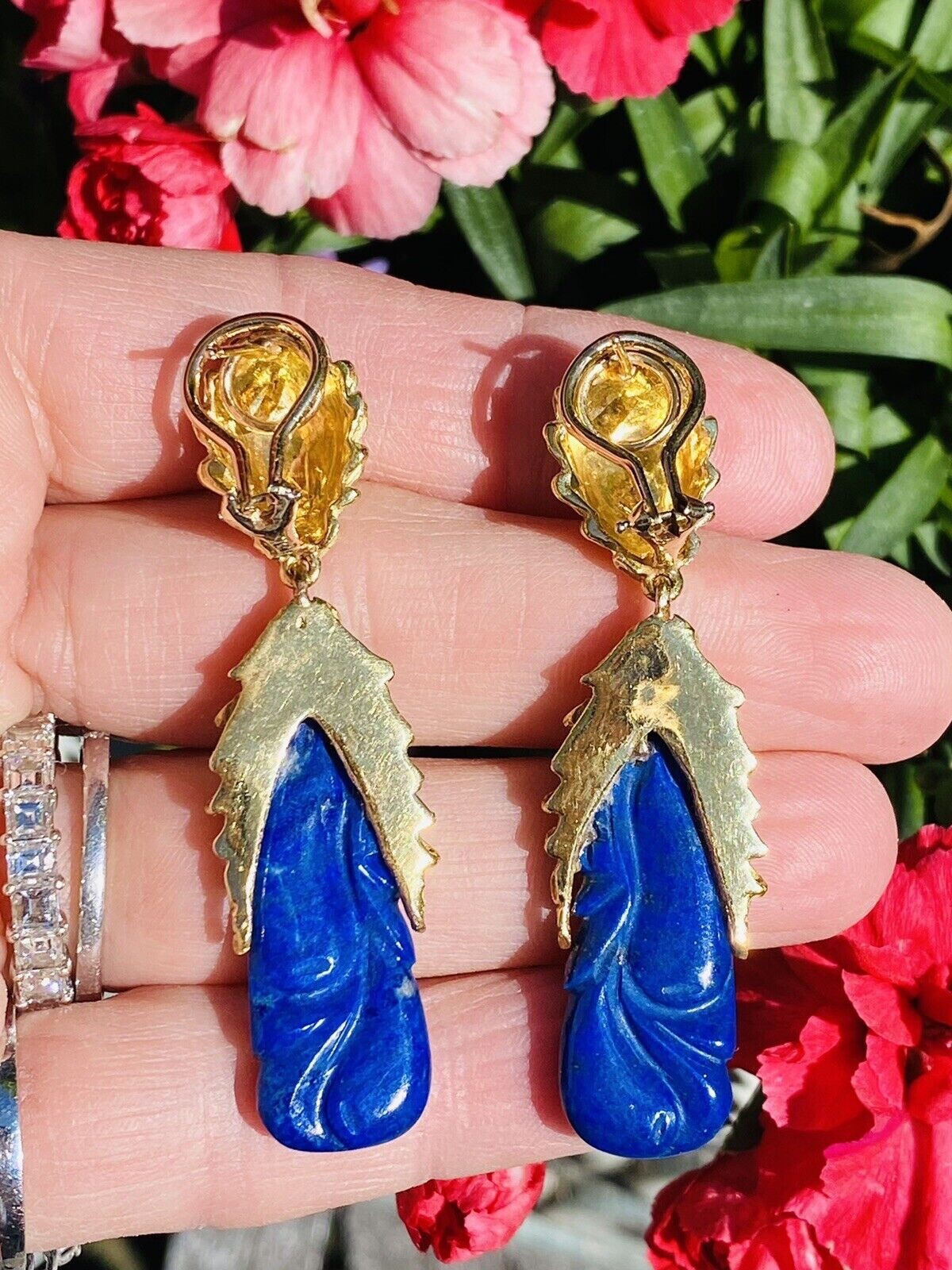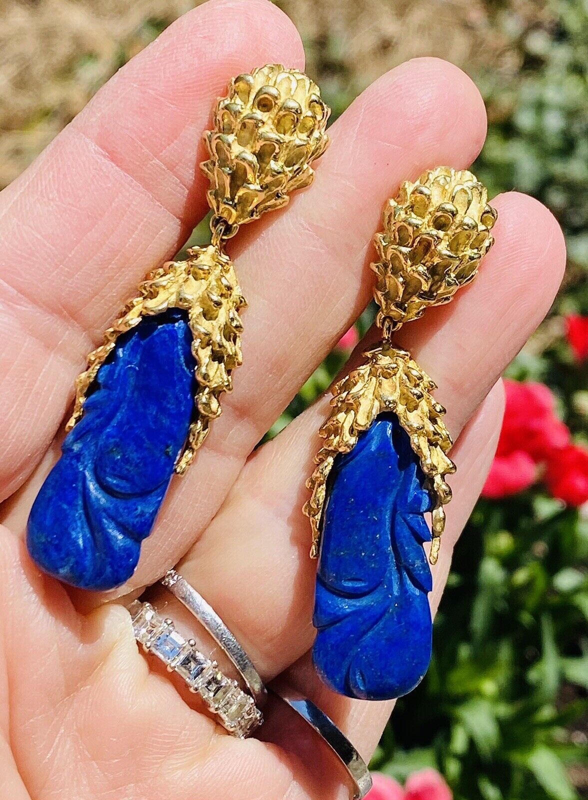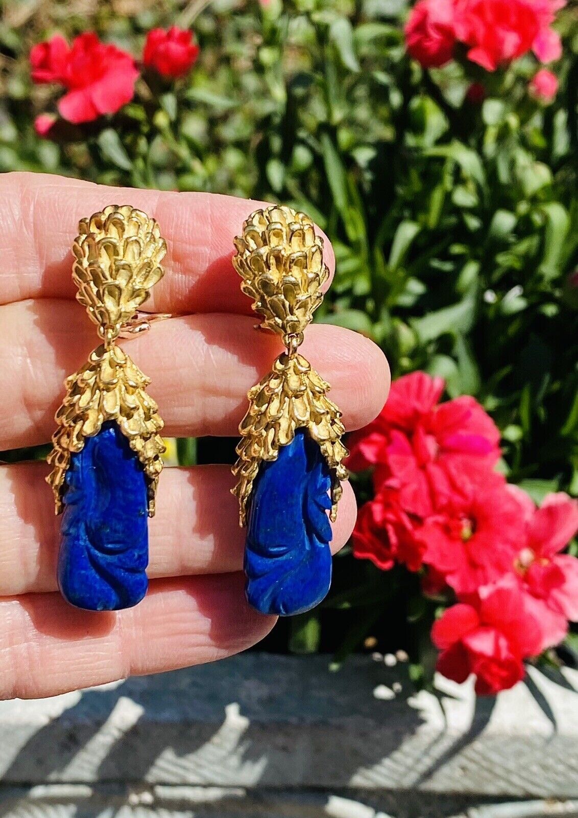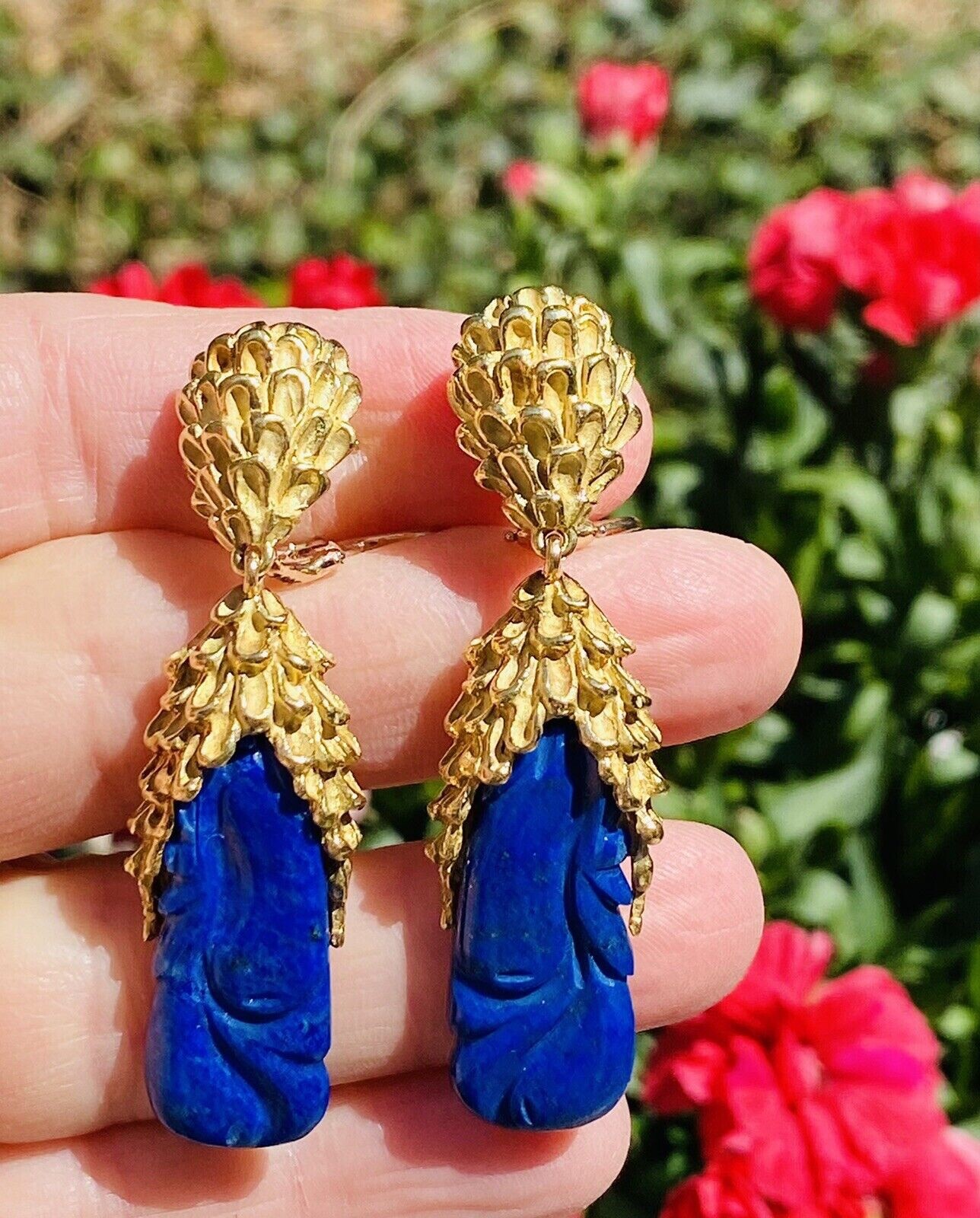 These impressive retro vintage 1960s-1970s statement earrings are set in rich texturized 18K yellow gold. The pendant style earrings feature two large carved royal blue lapis lazuli cabochon gemstones. The earrings dangle marvelously from the ear and while rich and heavy in gold weight they are still very comfortable set with posts and omega backs.