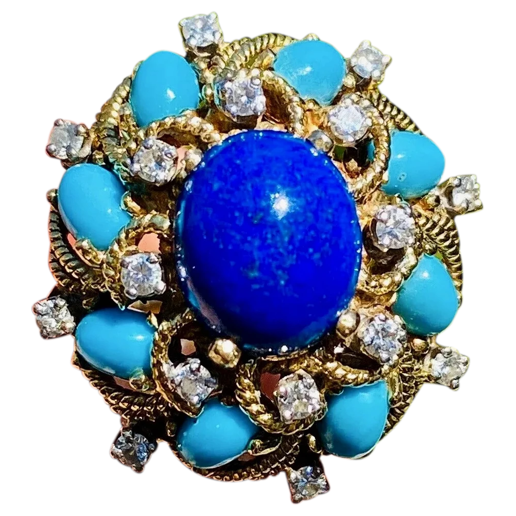 Large JGJLRY Heavy Estate Vintage 14k Lapis Turquoise Diamond Ballerina Ring