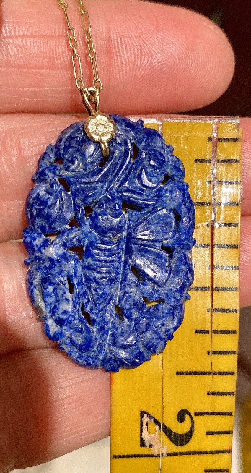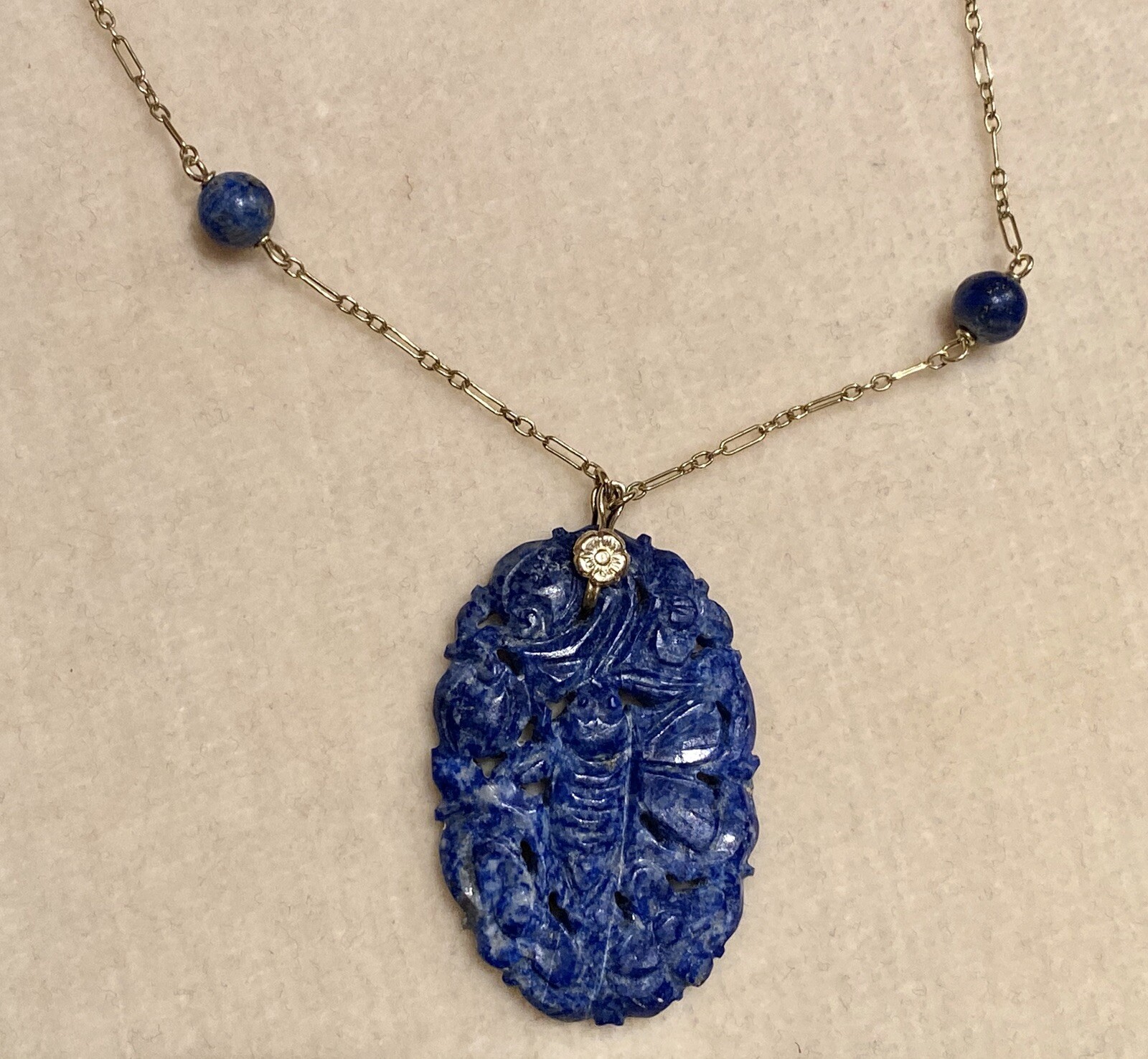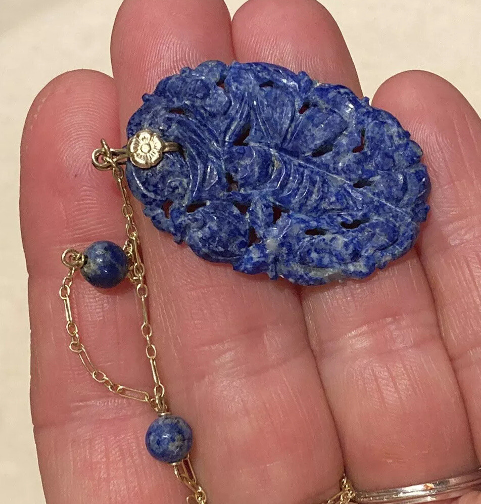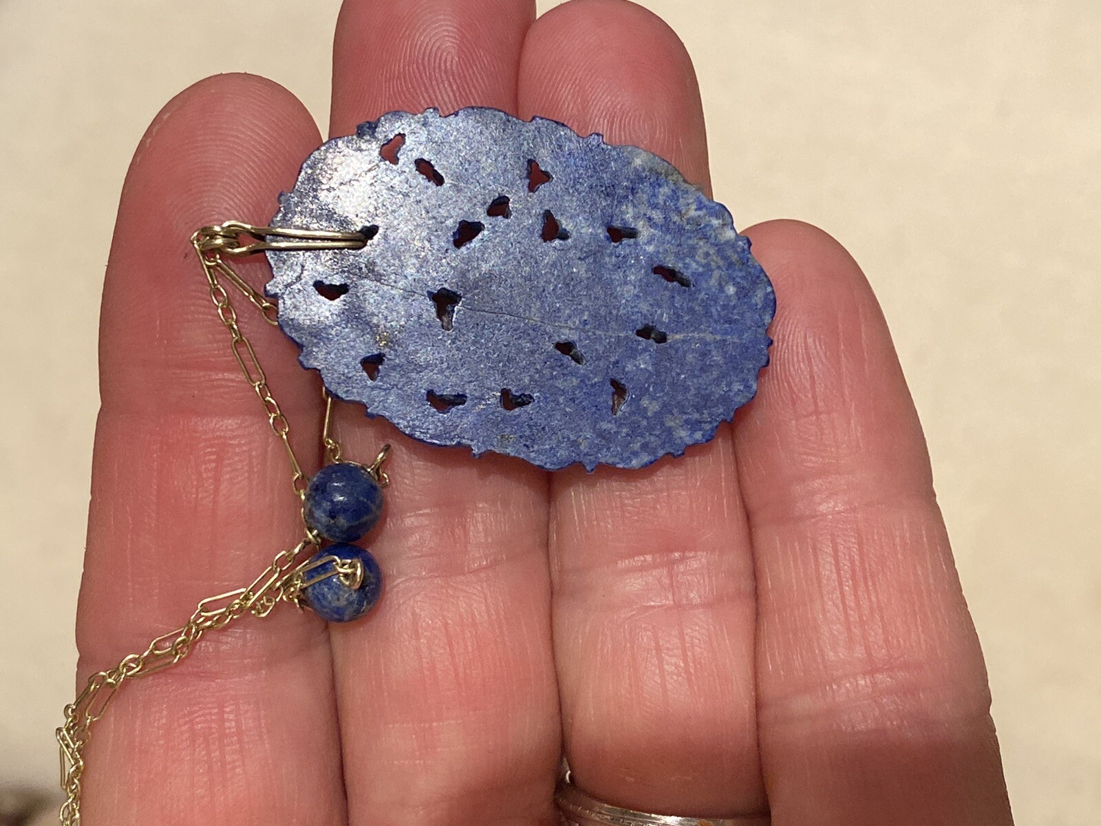 The carved piece features a faint engraving of maybe a butterfly or dragonfly. Very beautiful! It is delicate but sizable and brings a wonderful blue color to your neckline.  The blue is flecked with many white variations giving it a wonderful color tone, a beautiful blue tone.