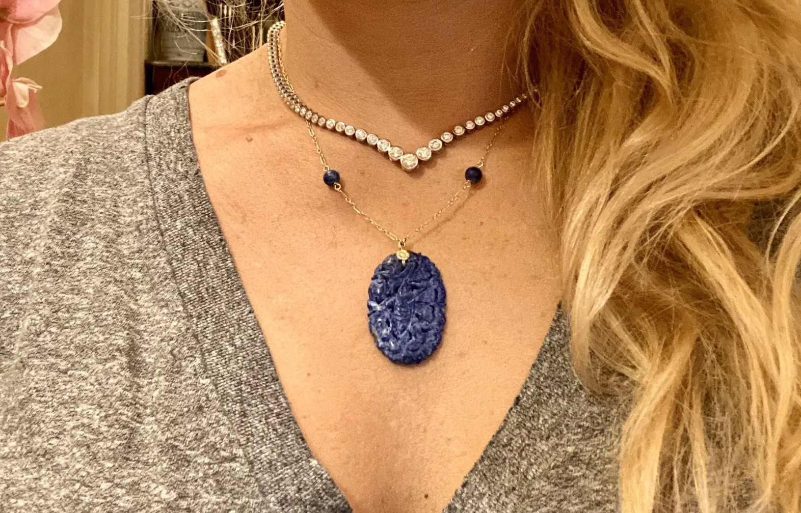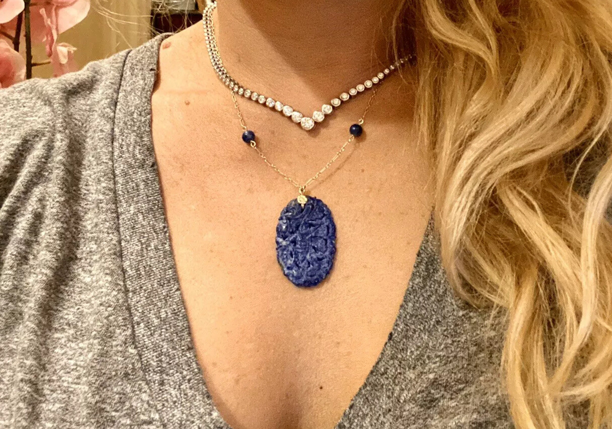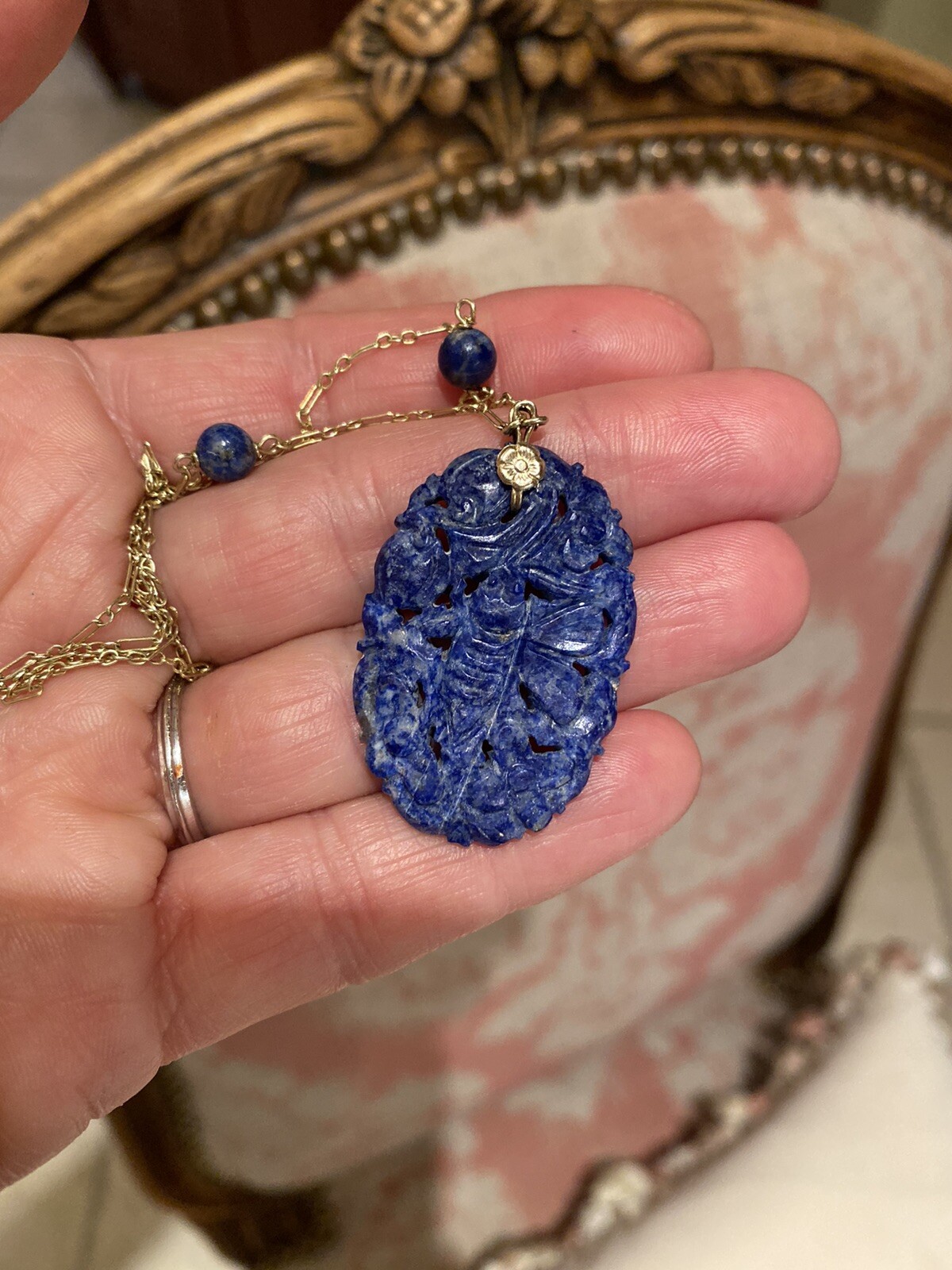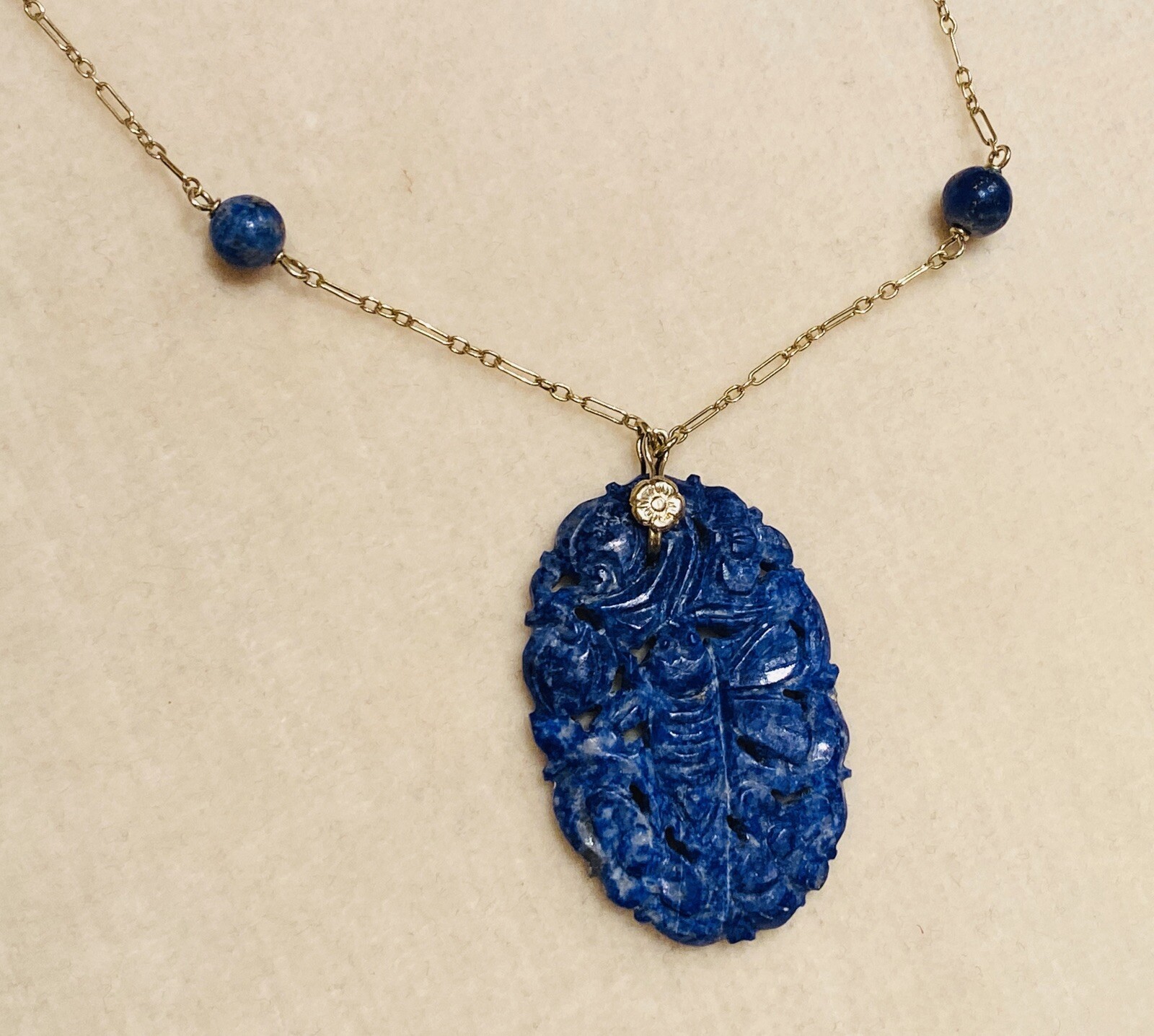 The carved piece features a faint engraving of maybe a butterfly or dragonfly. Very beautiful! It is delicate but sizable and brings a wonderful blue color to your neckline.  The blue is flecked with many white variations giving it a wonderful color tone, a beautiful blue tone.