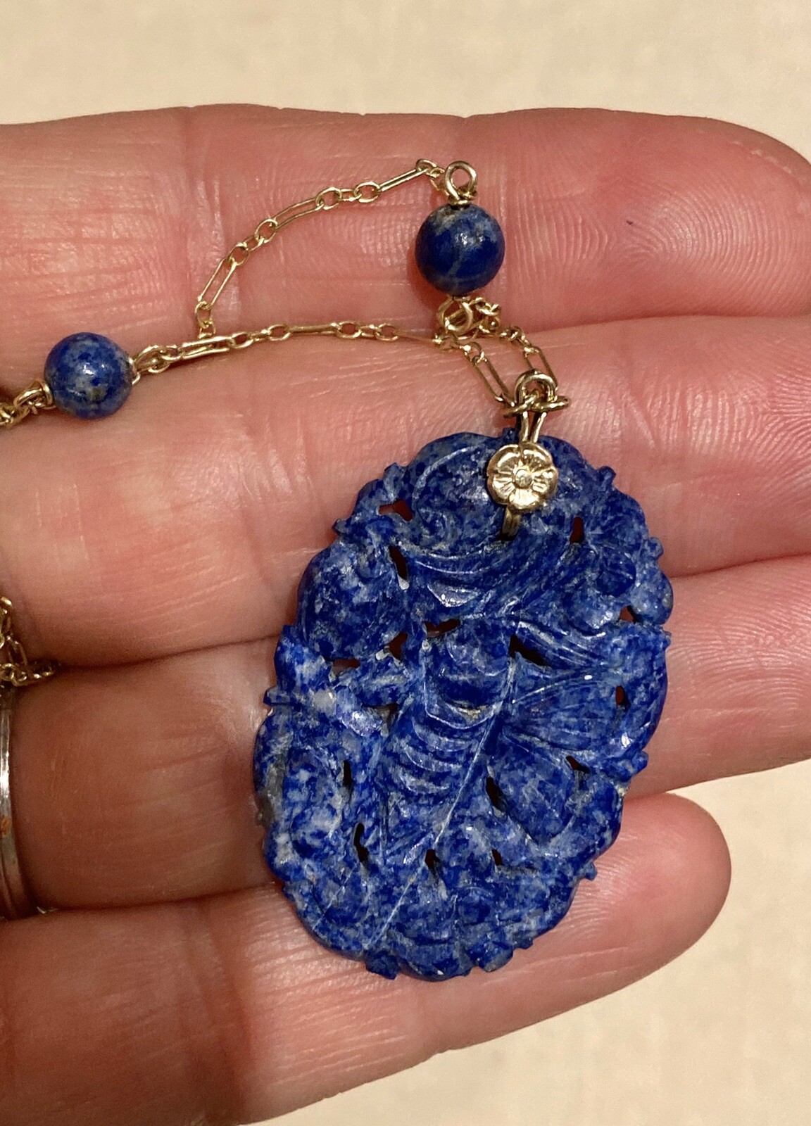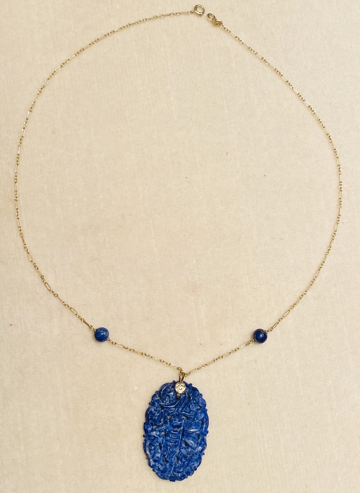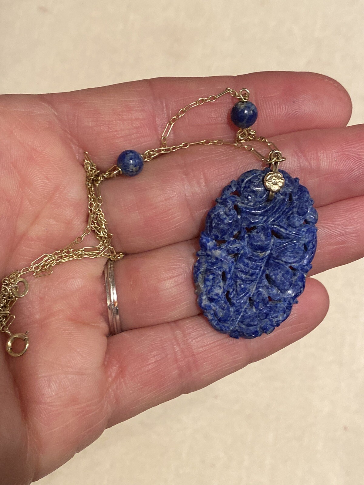 Vintage Retro Estate 14K Gold Carved Lapis Lazuli Bead Pendant Necklace 17"