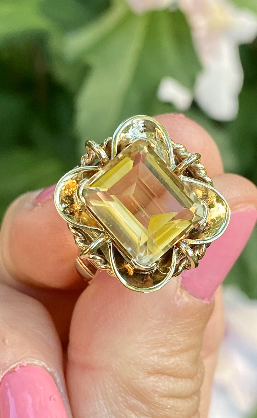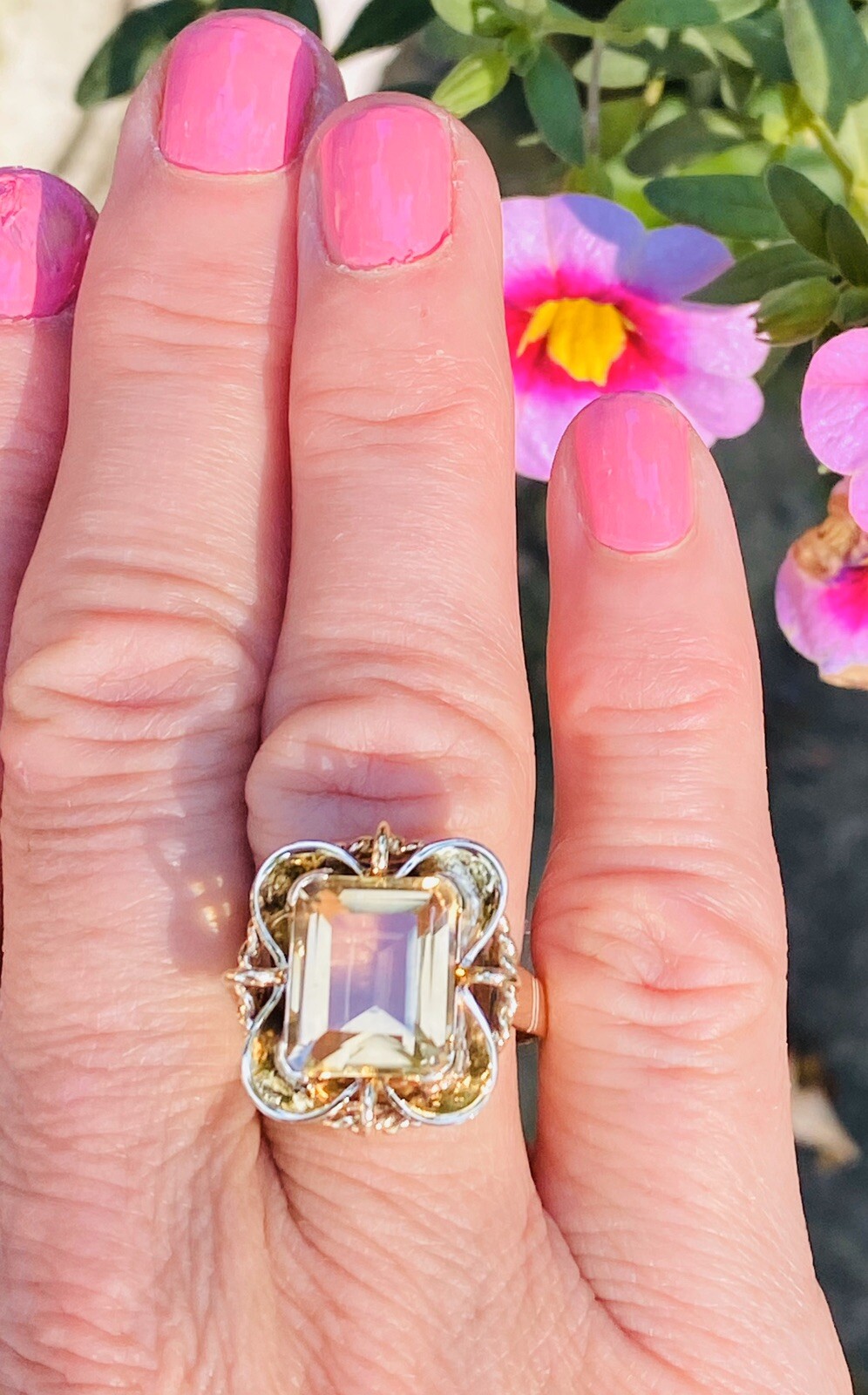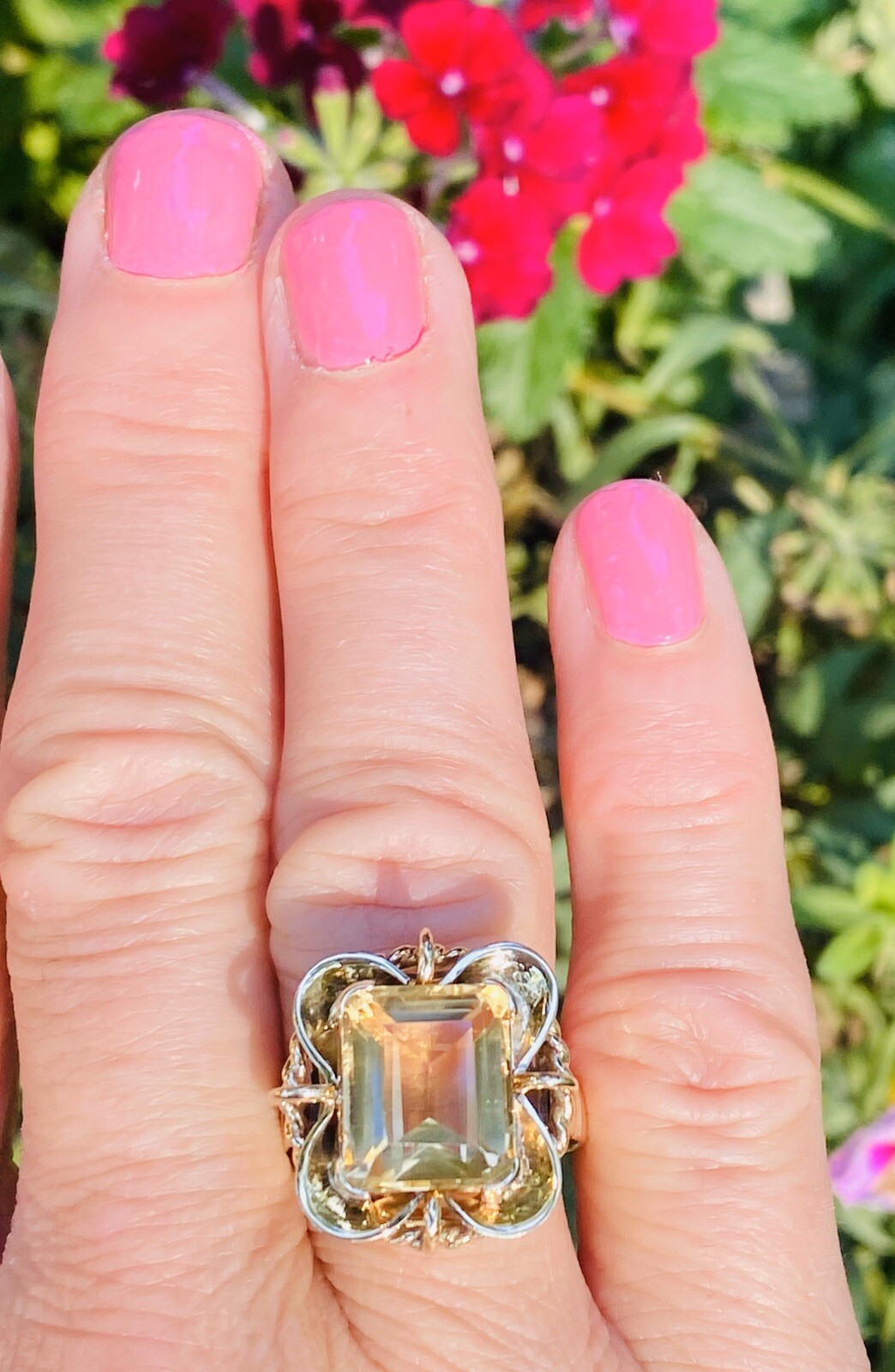 Vintage Retro Estate 14k Gold Large 5.57 Emerald Cut Citrine Midcentury Ring