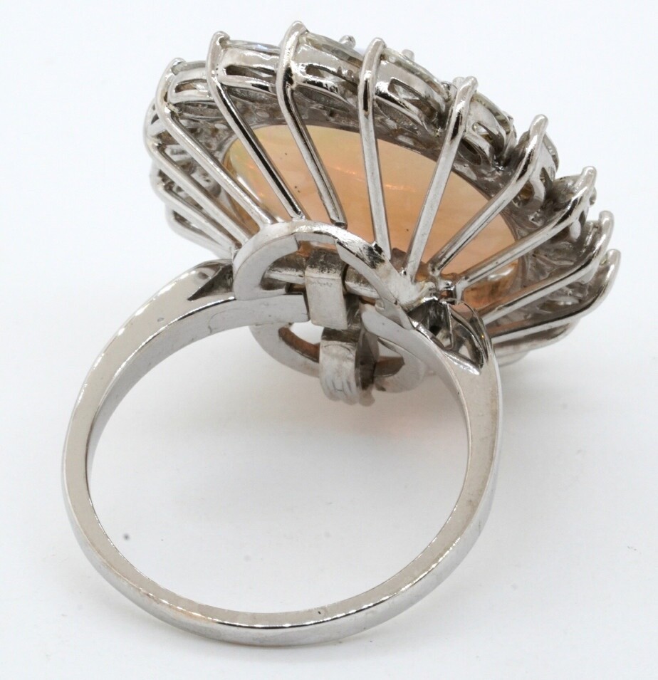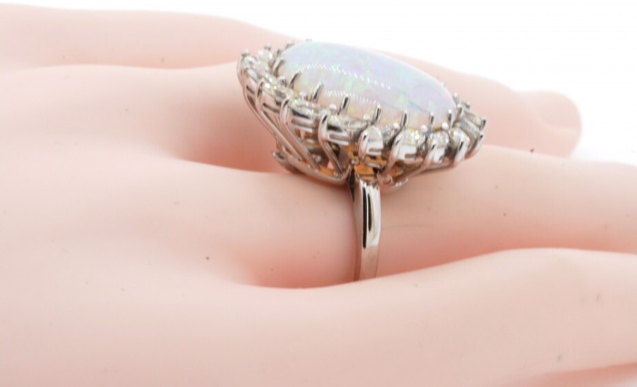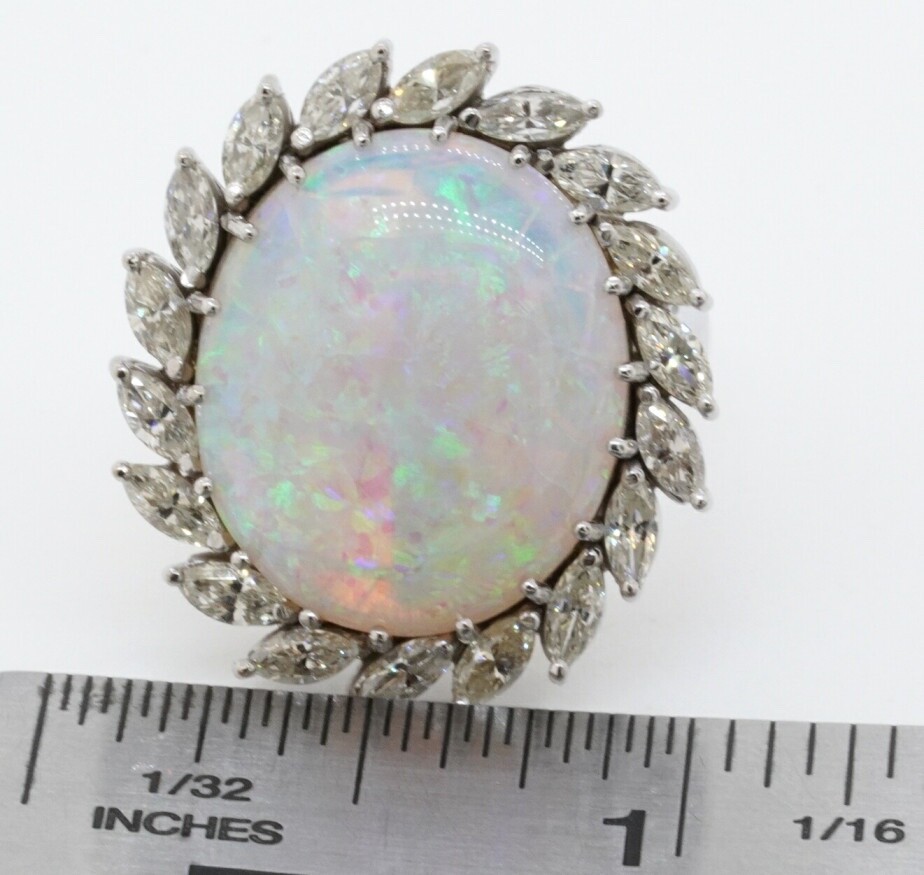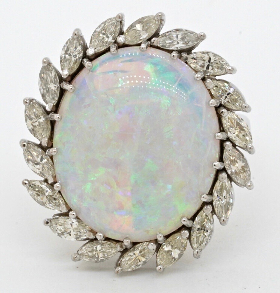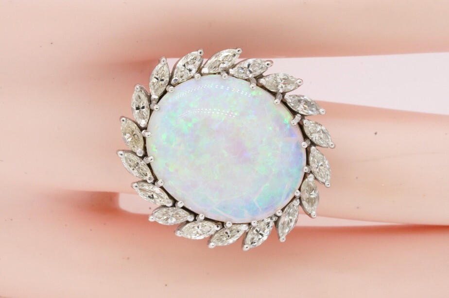 This impressive vintage 1950s Ring-Dant brand ring by Palais Jewelers (NYC) features a stunning playful large 19.6 x 16.6 mm oval Opal cabochon gemstone at the center.  The opal is surrounded by a stunning halo of marquise cut diamonds of colorless VS2-SI1 clarity.  The total diamond weight is approximately 2.20 carats.