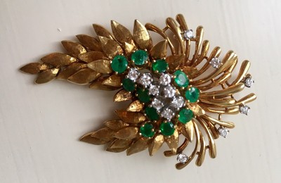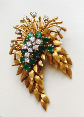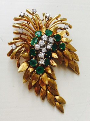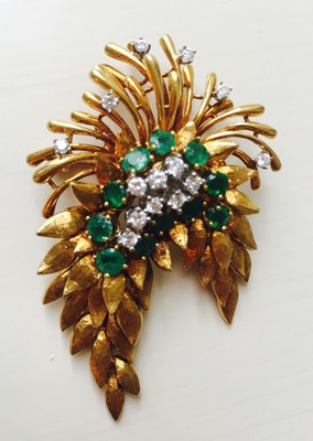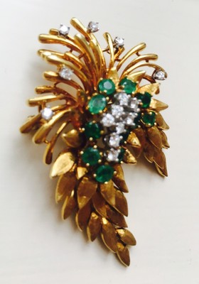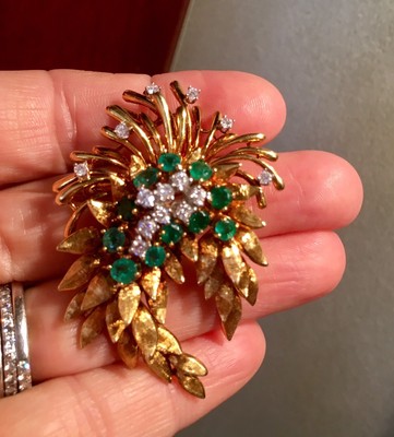 Stunning vintage estate "Des En France" 18K yellow and white gold floral brooch / pin featuring 3.63 carats of green faceted round Emeralds
