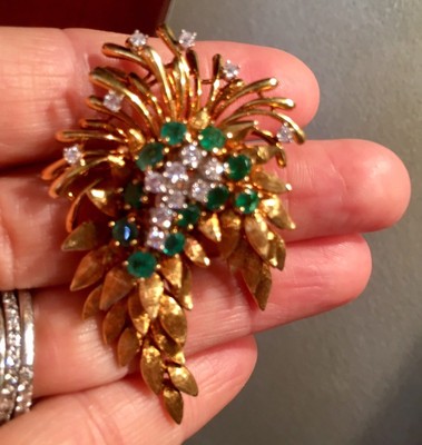 WOW Estate "Des En France" 18K Yellow Gold 4.84 Emerald G VS Diamond Pin/Brooch